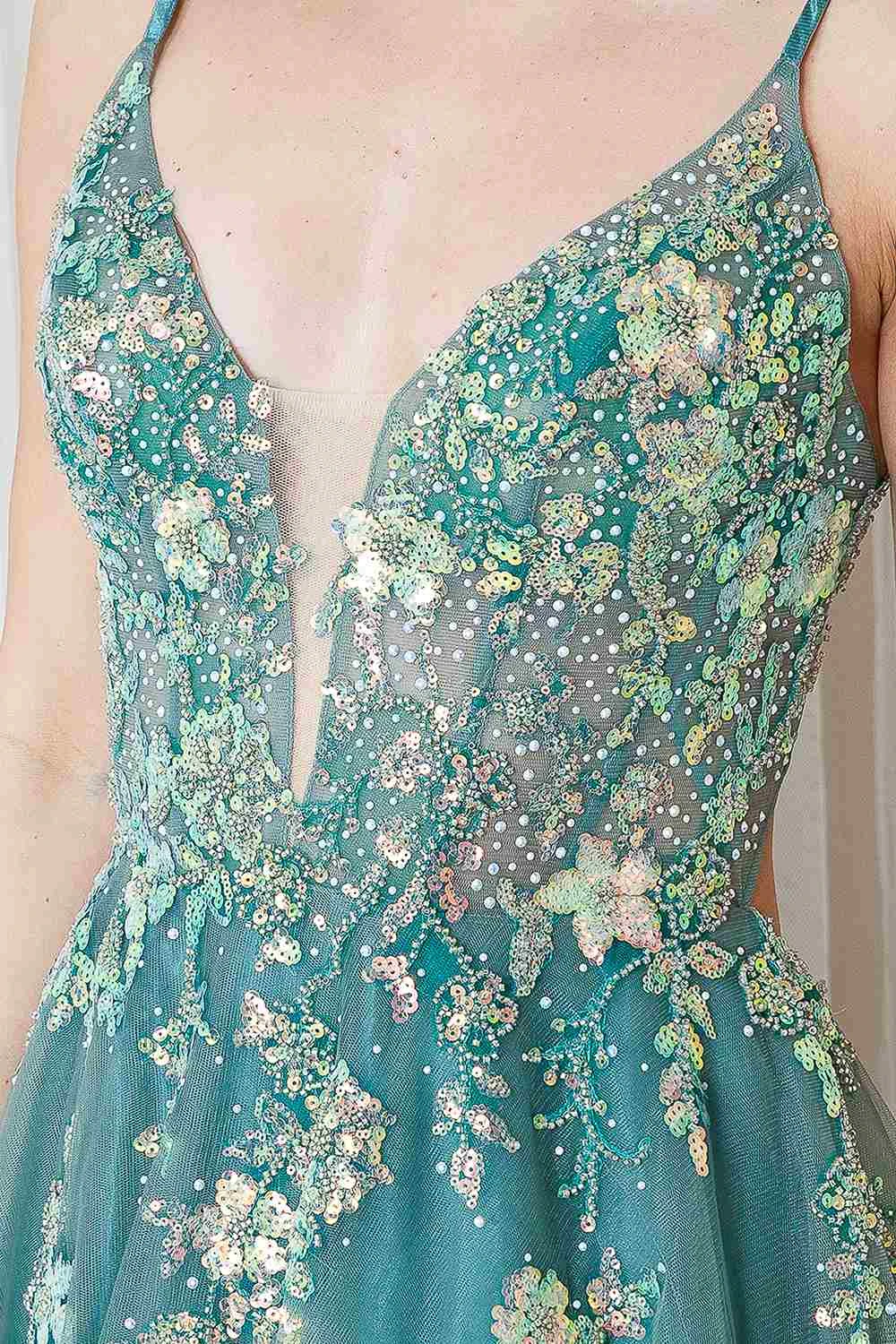 Introducing the Amelia Couture TM1003. This floor length A-line dress features a plunging V-neckline with a sheer inset, a corset bustier bodice with a high side leg slit, and a strappy, crisscross back with zipper closure. It’s finished with 3D flower applique, iridescent sequin and beaded embellishments, and a dreamy, ethereal flowy mesh skirt with a sweep train. Look effortless and stunning at your next special event. An ideal full-length dress for red carpet events, pageant, prom or in any other formal occasions!
