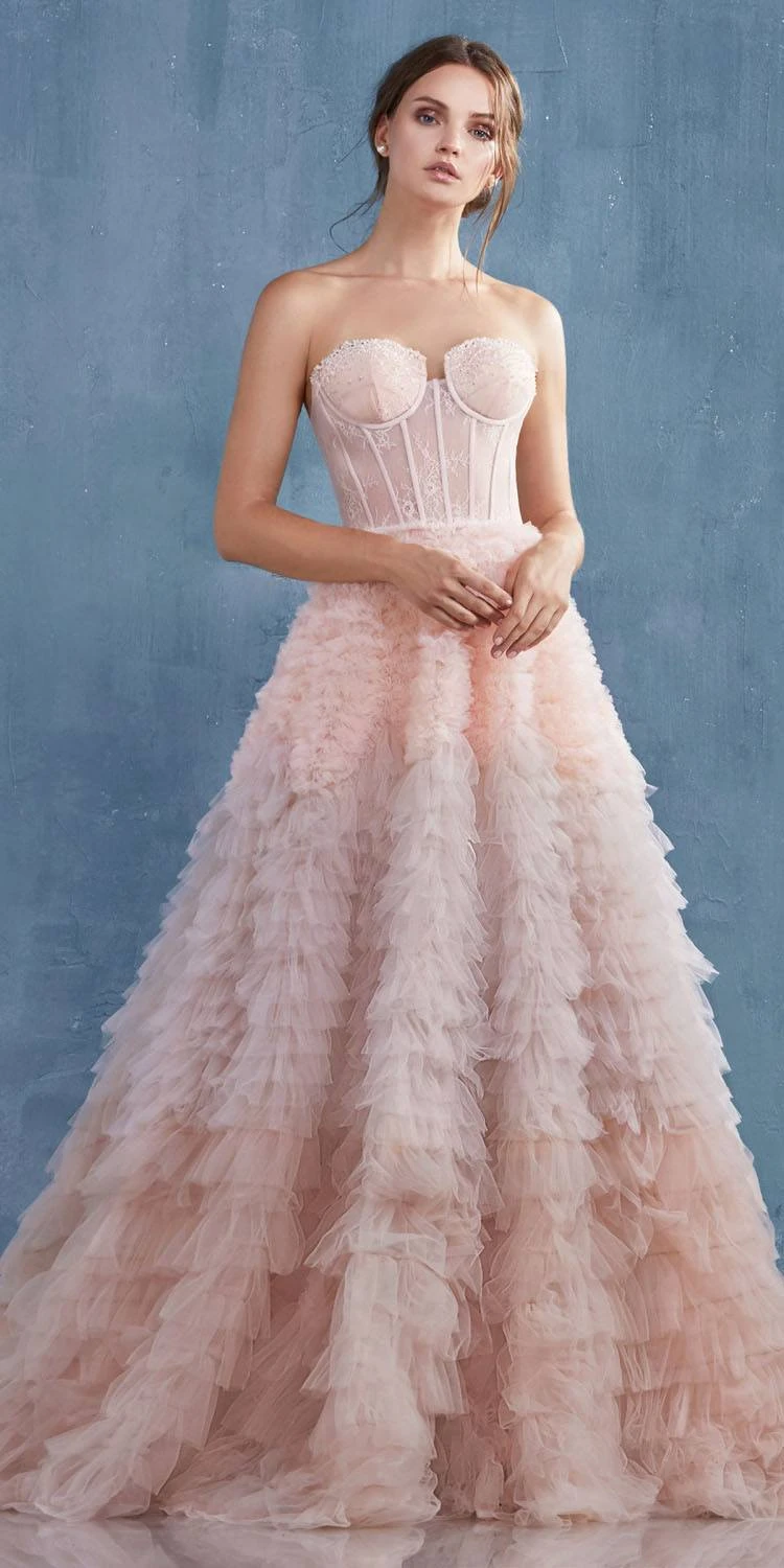This made of tulle tiered wedding gown by Andrea & Leo A0767, features a see-through made of lace bodice. The bra cap is embellished with glass beads and lace, while a corset lace-up back designed for easy adjustment and perfect fit. From natural waist the made of tulle full A-line tiered skirt softly drops down the floor and finished with a fanciful court train. Enjoy every moment and be the most glamorous bride with this strapless long wedding dress!