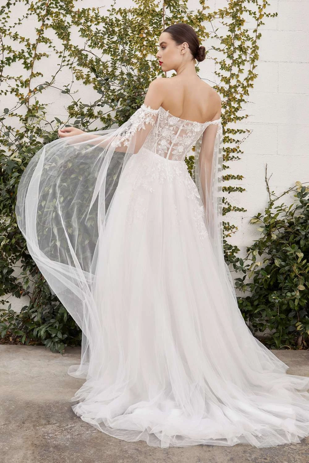 Imagine yourself wearing this beautiful long formal A-line wedding dress by Andrea & Leo A1080W. This wedding gown features a floral embroidered long cape, an off the shoulder corset boned bodice floral embroidery, cape sleeves and illusion back. A one-of-a-kind long dress for your once in a lifetime wedding!