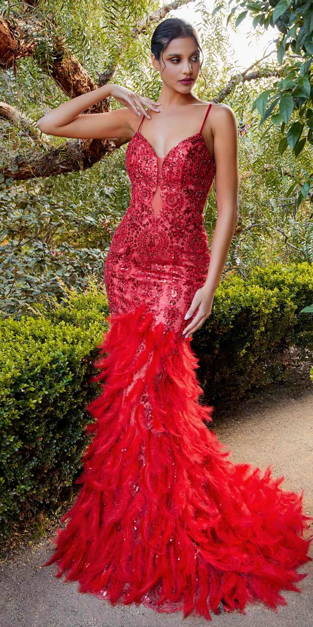 Introducing the stunning mermaid by Andrea & Leo A1297. This floor length dress features thin spaghetti straps and an illusion sweetheart neckline, showcasing elegance and glamour. The paisley-like beading motif, open lace-up corset back, and faux goose feather lower skirt ignite passion, making you the vision of beauty. The fitted silhouette hugs the body and sweeps the floor, turning heads and stealing the show. This formal full-length dress is definitely a one-of-a-kind long dress for red carpet events, pageant, prom or in any other formal occasions!