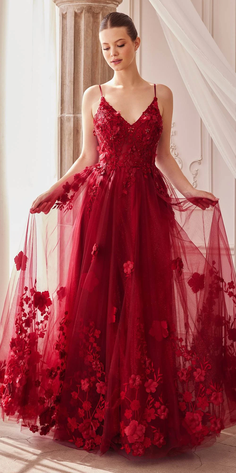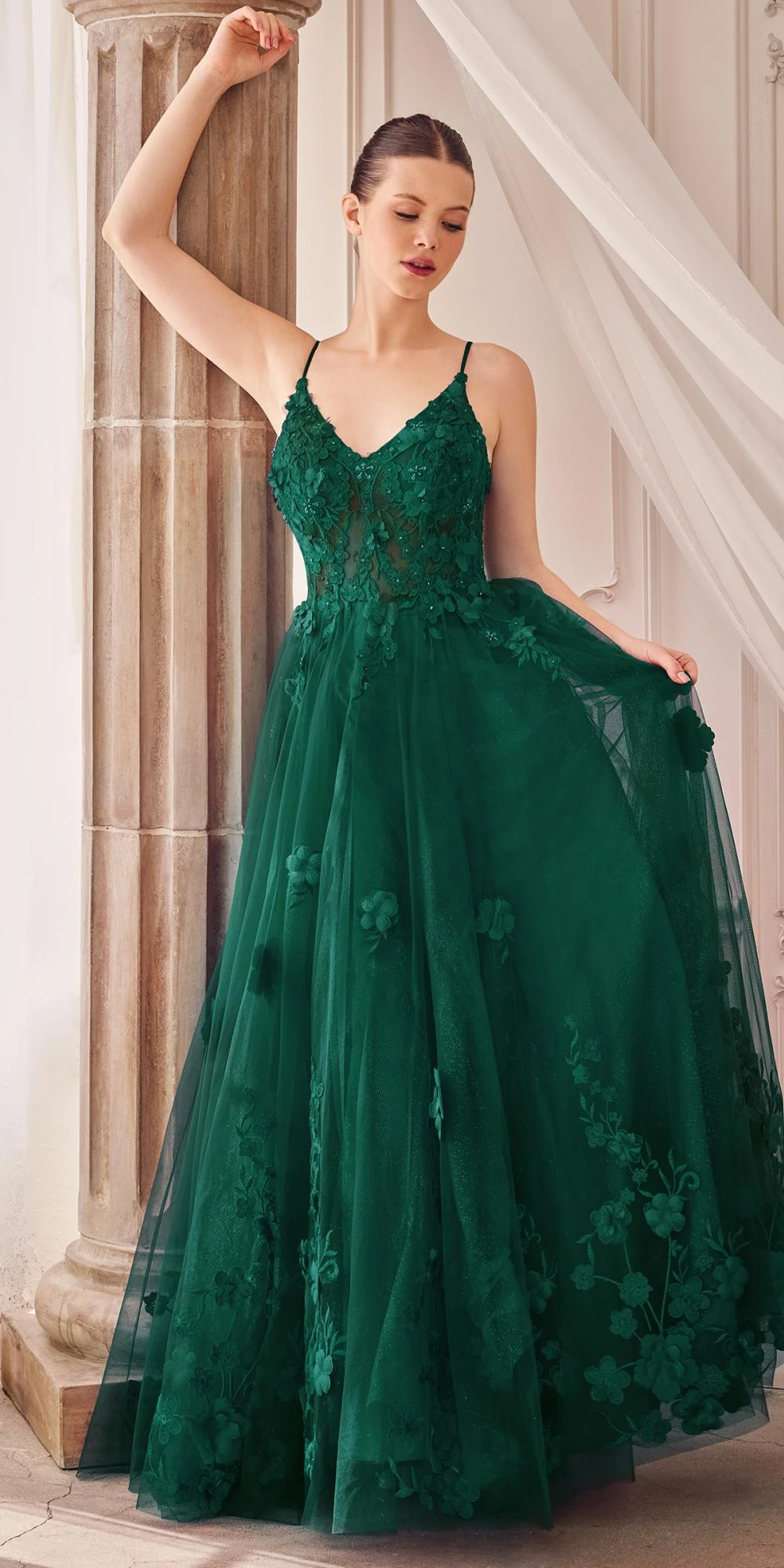 Feel like a true romantic princess in this Andrea & Leo A1326 A-line gown. With a stunning V-neckline and spaghetti straps, this formal dress exudes elegance and grace. The sleeveless, lace appliqued bodice perfectly complements the layered tulle skirt adorned with dimensional floral applique, creating a poetic and whimsical look. The sweep train and open mid back add a touch of timeless allure. Perfect for any special occasion, this dress is a true poetry of romance. This formal dress is definitely a one-of-a-kind long dress for red carpet events, pageant, prom or in any other formal occasions!