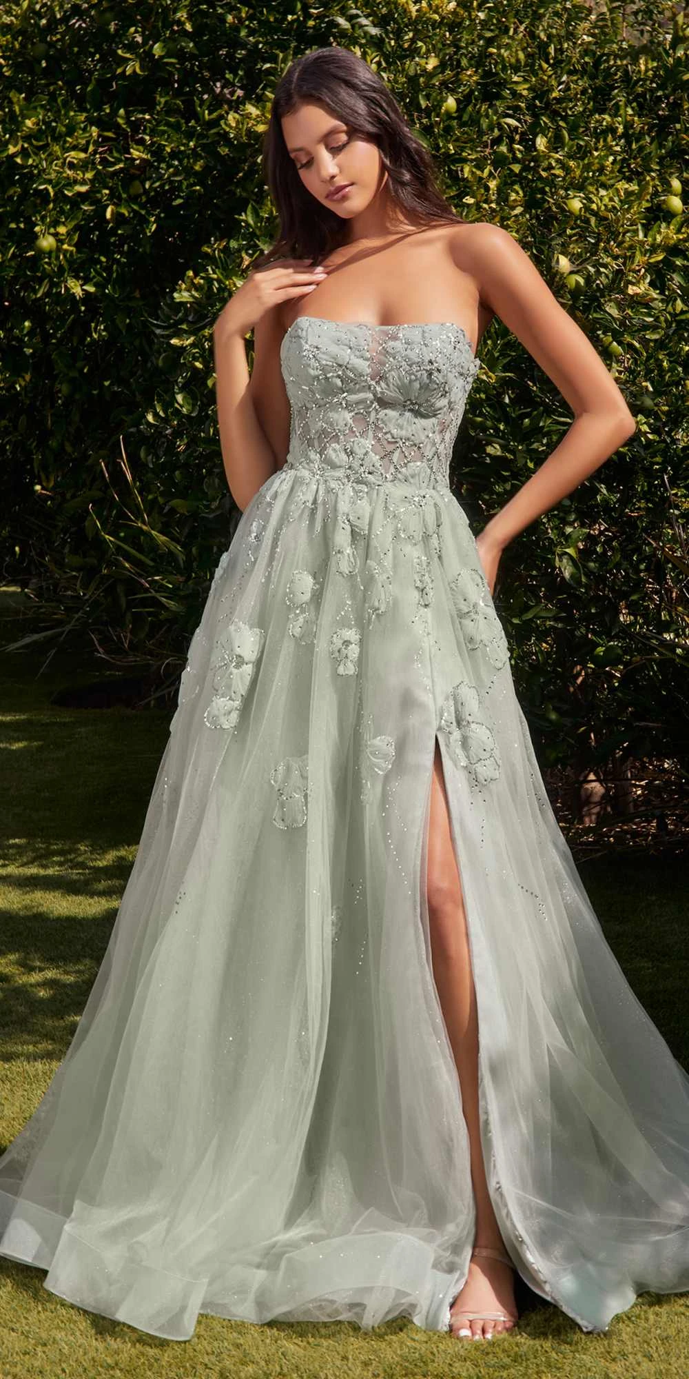 Indulge in the ethereal and fairytale feel of this A-line ball gown by Andrea & Leo A1346. Dance the night away with the flowing tulle skirt, adorned with delicate floral cut-out applique. The strapless, sleeveless straight neckline and sheer boned bodice add a touch of timeless beauty. With a sweep train and leg slit, this formal dress also features an open corset lace-up tie back for a perfect fit. This formal full-length dress is definitely a one-of-a-kind long dress for red carpet events, pageant, prom or in any other formal occasions!