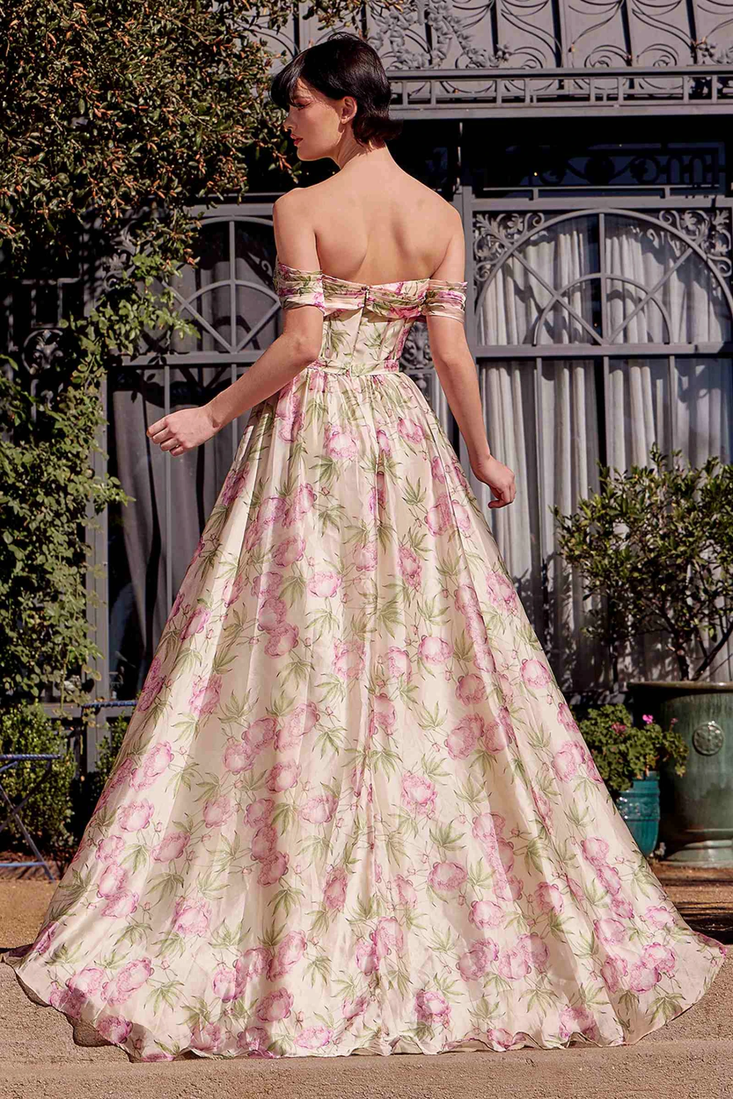 This A-line dress by Andrea & Leo A1466 showcases an off-the-shoulder sweetheart neckline paired with a beautifully pleated bodice, creating a look of refined charm. Crafted from soft organza with a delicate floral print, it flows gracefully for a dreamy, ethereal effect. With its structured bodice ensuring a flattering fit, this gown is an exquisite choice for prom or any formal occasion.