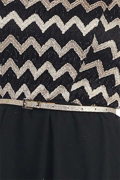 Enjoy the evening in this cute high low black semi formal dress. This high low chiffon gown is strapless with a sweetheart neckline, a beautiful embroidered chevron patterned bodice and includes the belt around the waist. Great for wedding guest, semi formal and many different occasions!