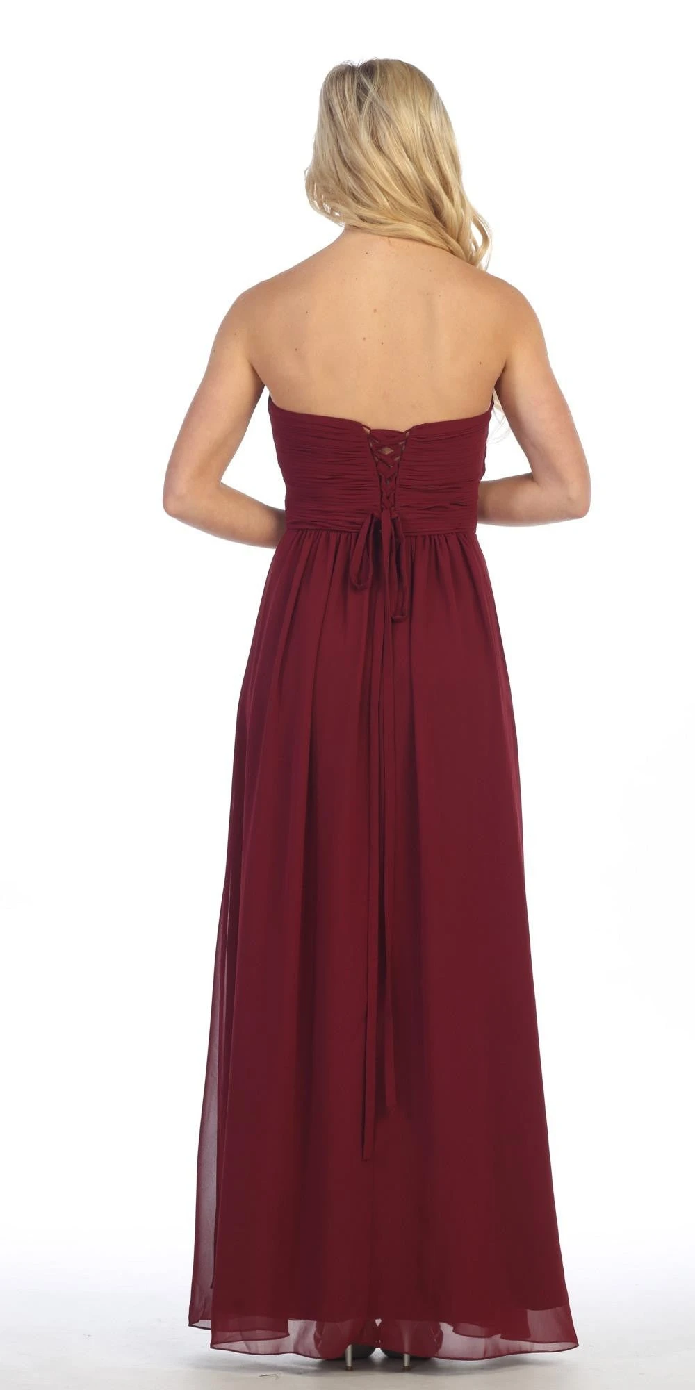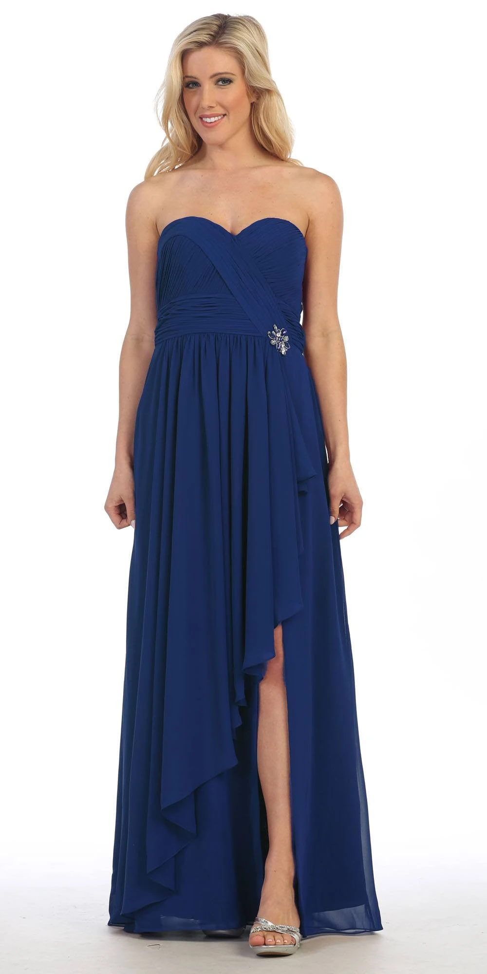 Full length formal gown featuring asymmetrical open front slit, a strapless sweetheart, side brooch and ruching. The back of the dress comes with a corset lace up tie back.