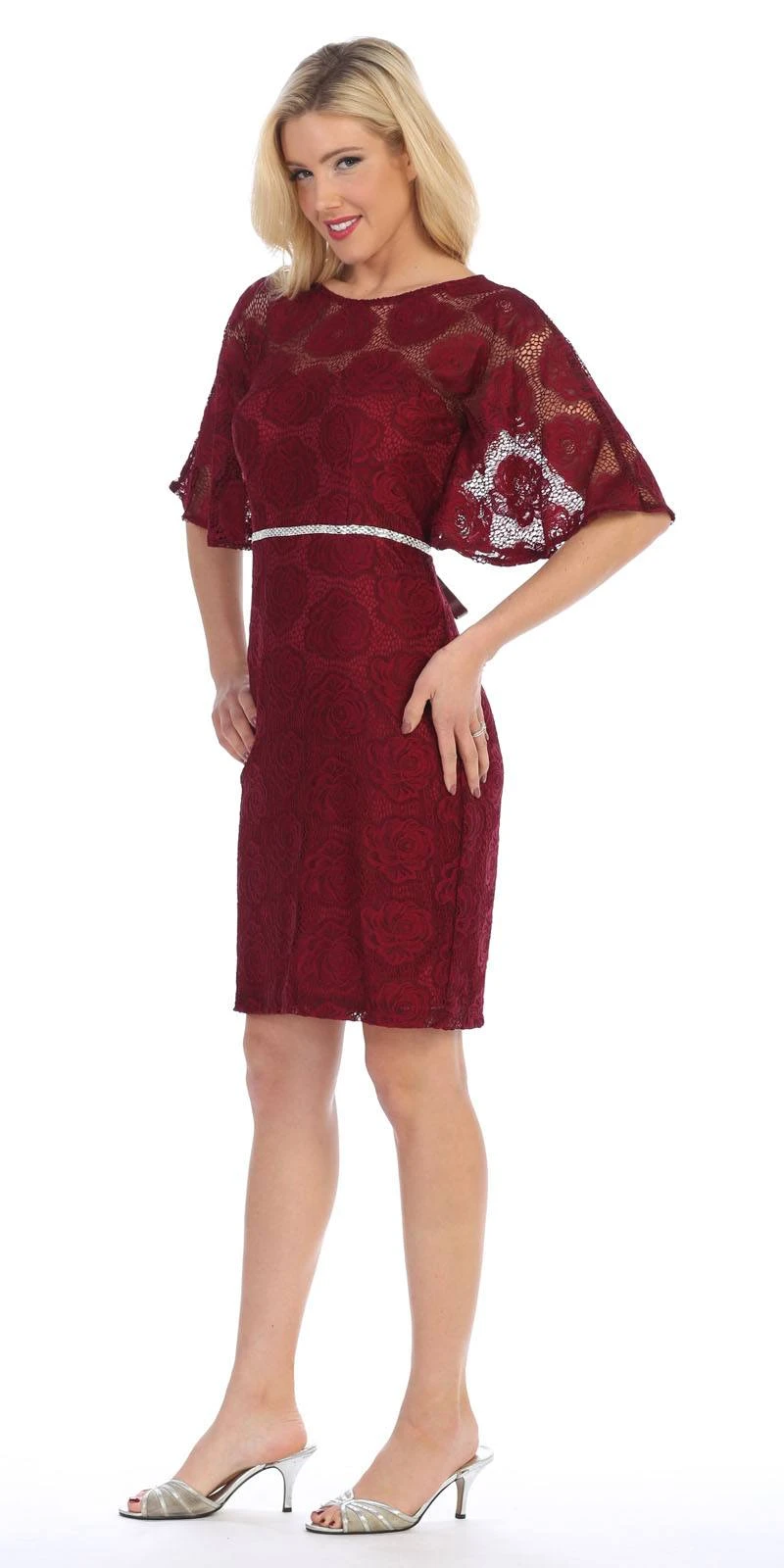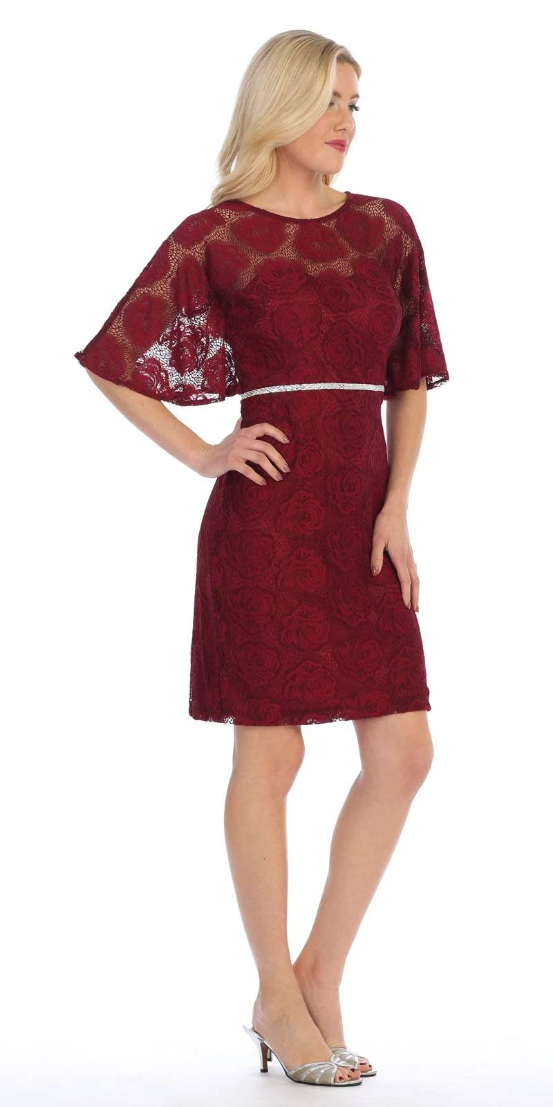 Slip into this lovely short lace dress by Celavie 6337 in burgundy. A gorgeous sheath silhouette knee-length dress with a little sparkle of glimmering thin waistband and flutter sleeves with round neckline. This made of lace dress is a delightful outfit for wedding events, cocktail party, graduation rites or any other semi-formal events.