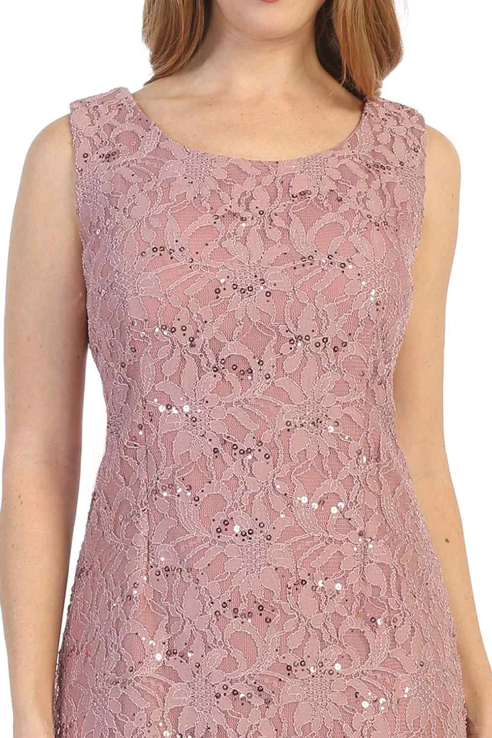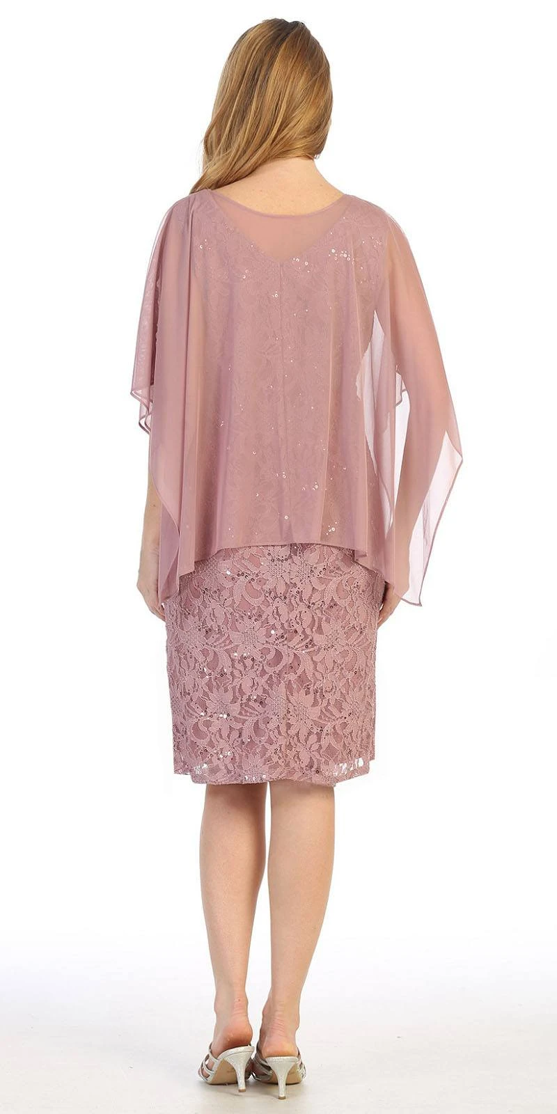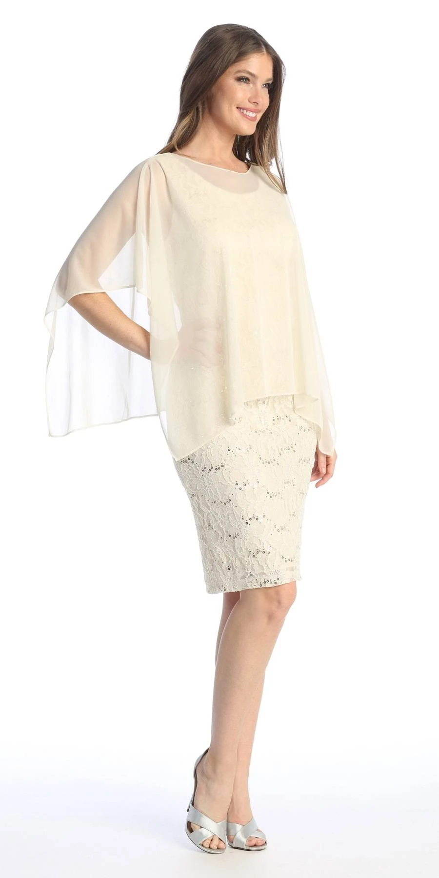 Step into this beautiful short lace semi-formal dress by Celavie 6365. This knee-length dress is made of lace with sequins and attached with removable chiffon poncho overlay. A perfect and elegant outfit for wedding guests, cocktail party or any other formal or semi-formal events.