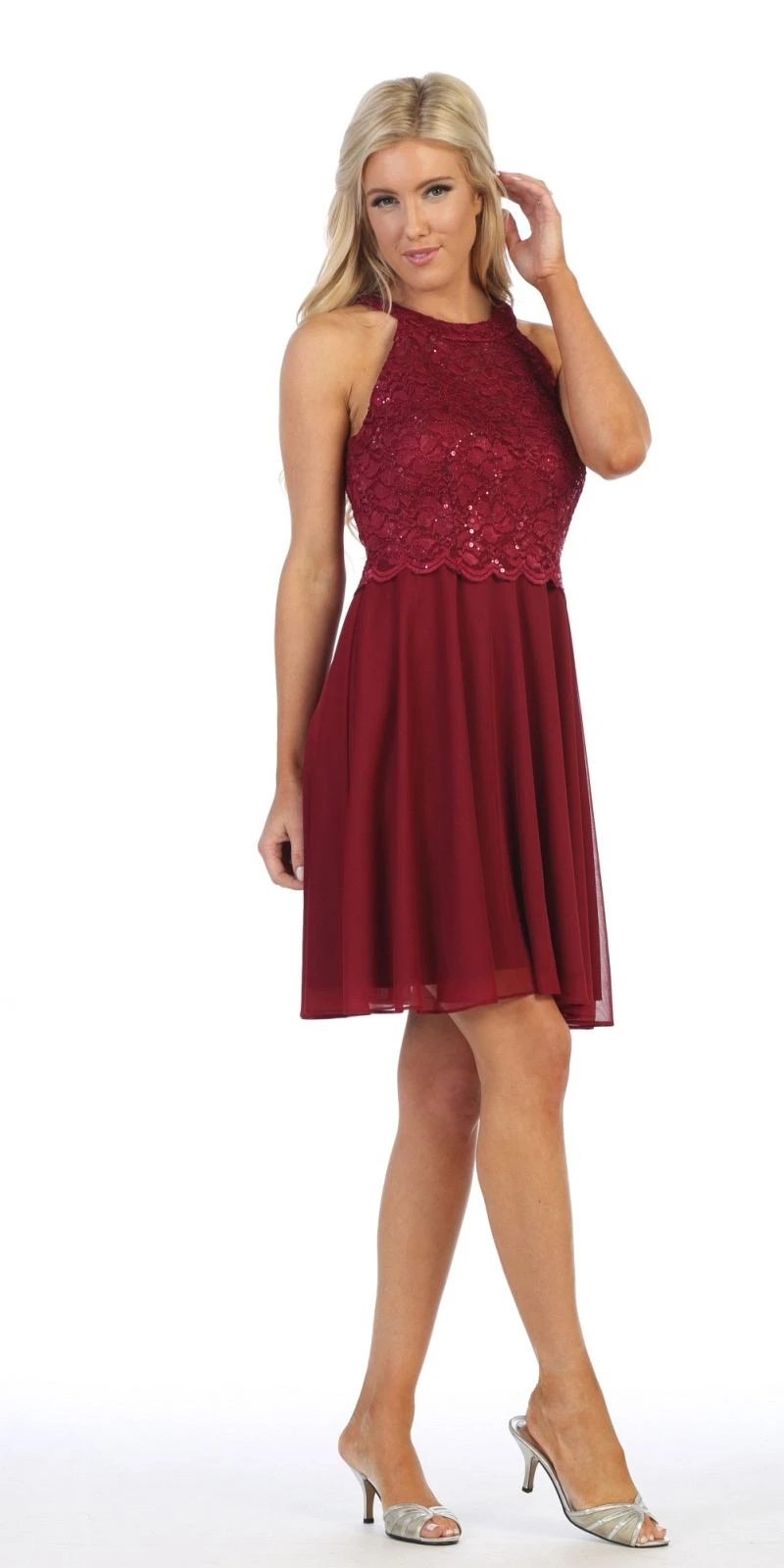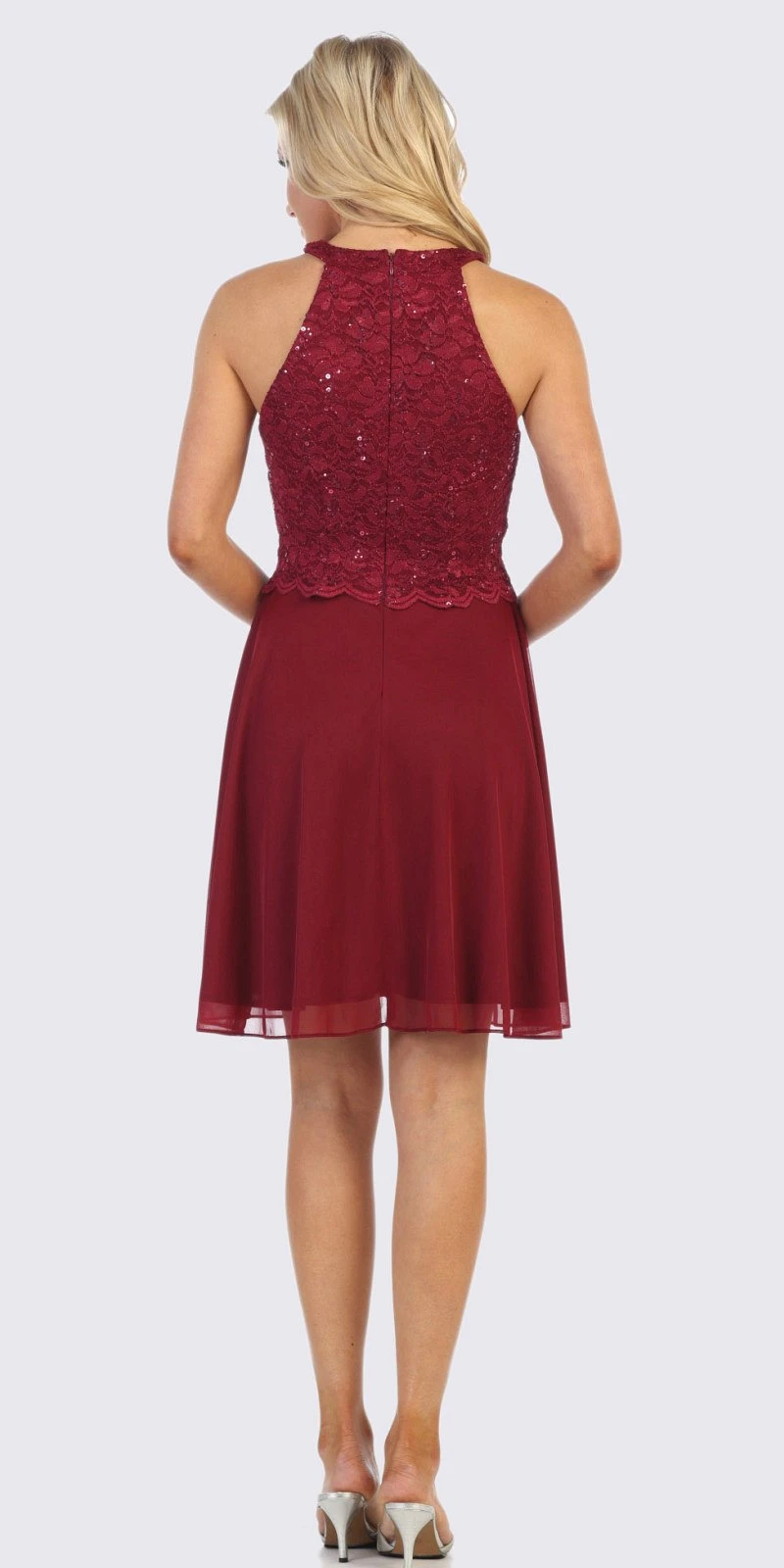 Step into this beautiful short a-line silhouette dress by Celavie 6398. A lovely cocktail dress features a halter high neckline, lace bodice with scallop fringe that emphasize the natural waist and shirred chiffon flaring skirt. A short party dress perfectly made for wedding guests, graduation party, dinner party, birthdays or any other special celebrations.