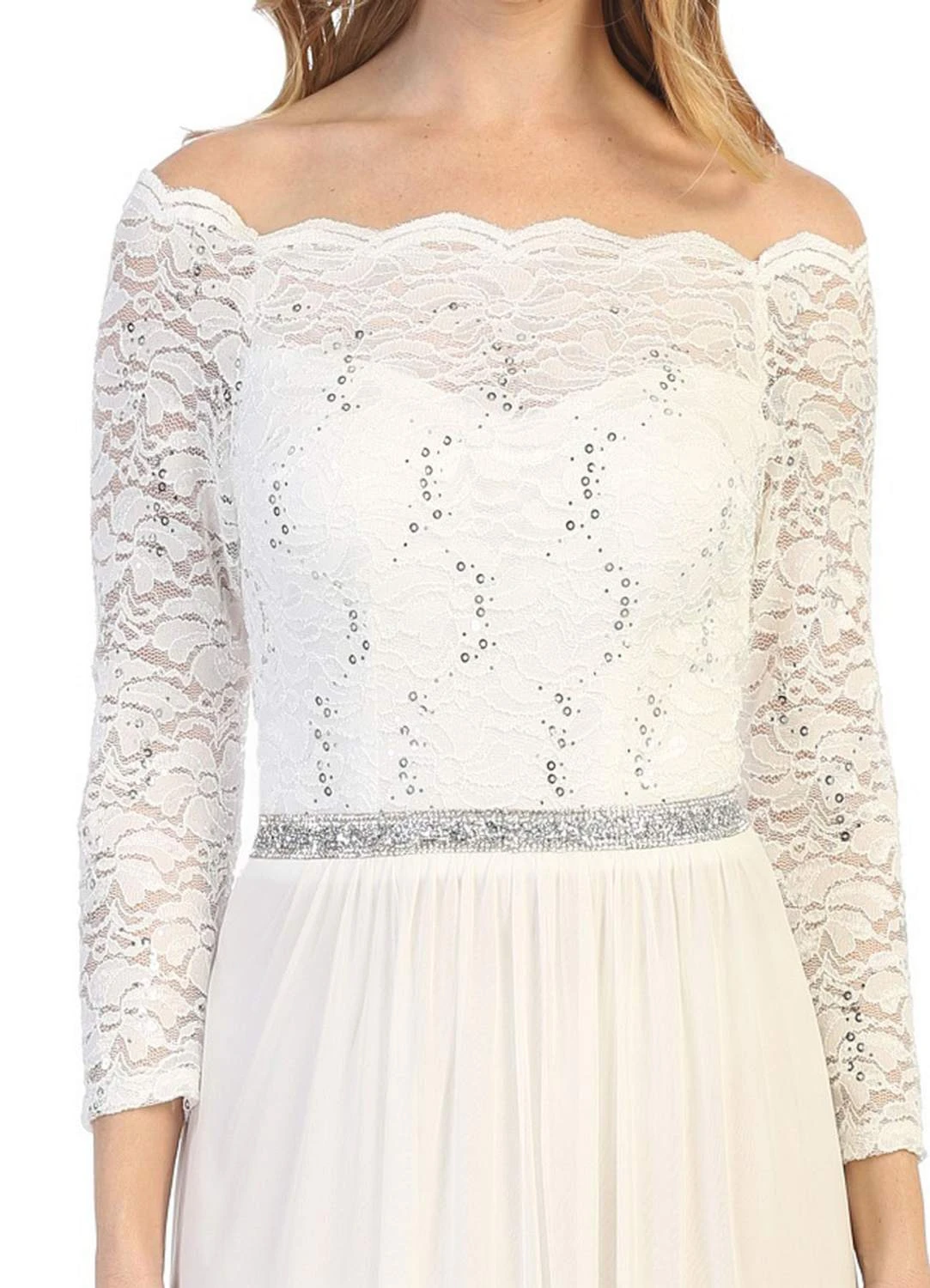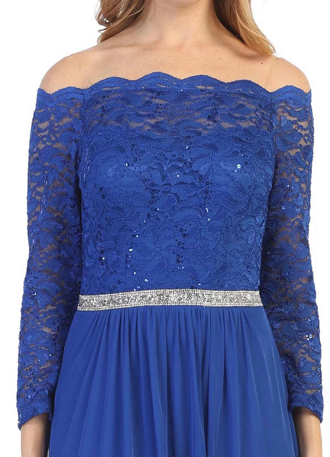 This elegant long sleeved off-the-shoulder floor length dress by Celavie 6468L is perfect for wedding events, awards and gala nights or in any other formal occasions! A long formal dress that features a made of lace bodice with stylish scallop neckline. The natural waist is adorned with dazzling fixed belt crowning the graceful chiffon skirt. A classy outfit any formal events!
