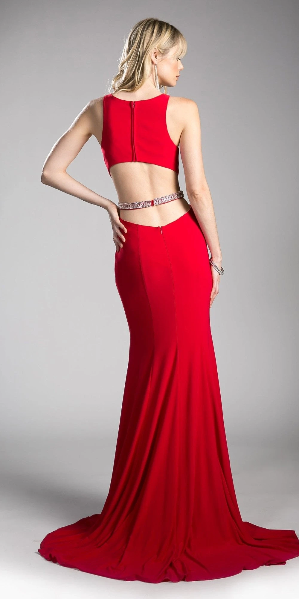 A fantastic style of long prom dress by Cinderella Divine 62806. Sheer cut out bodice, sleeveless floor length evening gown with beaded waist and open cut out back. Added features with this gown are the hips to hemline sheer panels and a sweeping train.