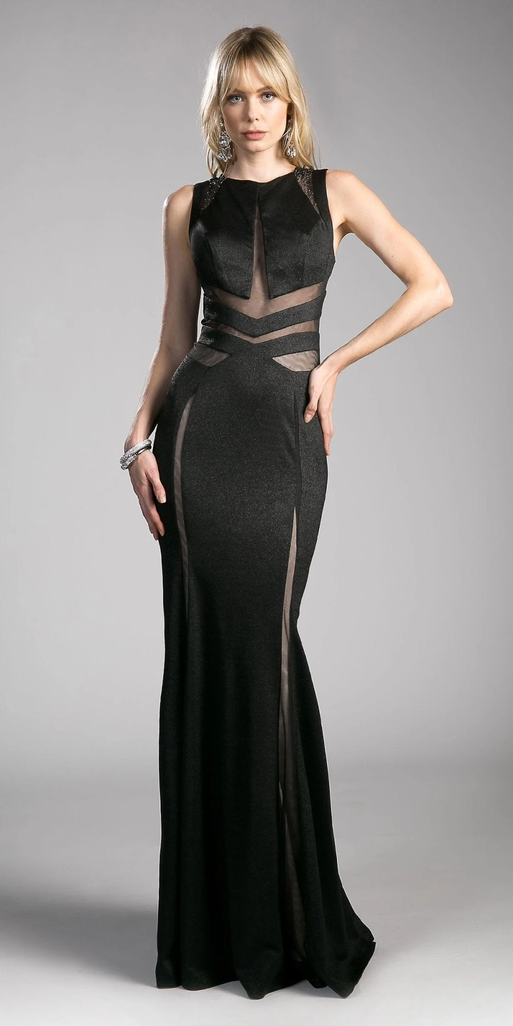 Have this remarkable floor length prom dress by Cinderella Divine 84792 in black. This long dress features sheer panel cut outs with bead embellishments along the shoulders. The sheer panel details from hips to hemline are added features that makes this dress a fabulous outfit for formal occasions.