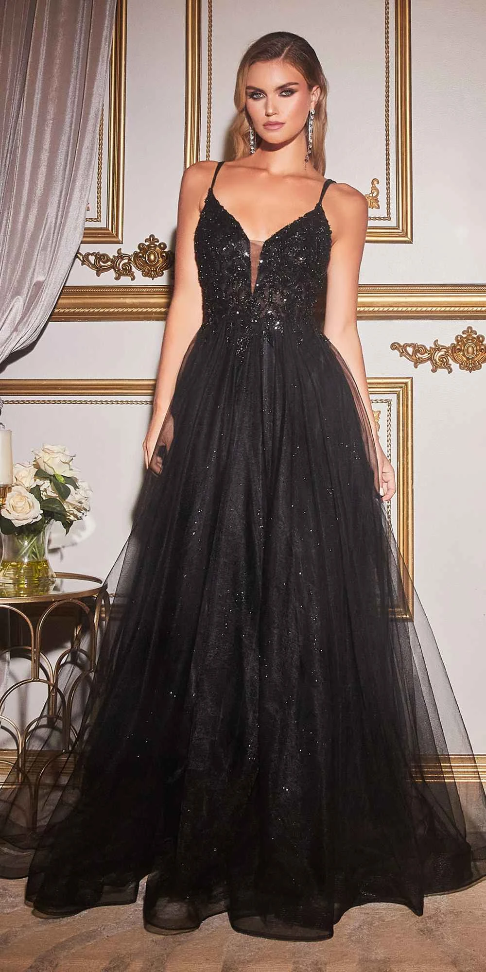 Enjoy the evening in this beautiful floor length tulle A-line gown by Cinderella Divine CD0154. This long dress features a lace bodice embellished with beaded applique and V-neckline with insert. You’ll have a great and memorable time wearing this sleeveless dress at your next formal occasion.