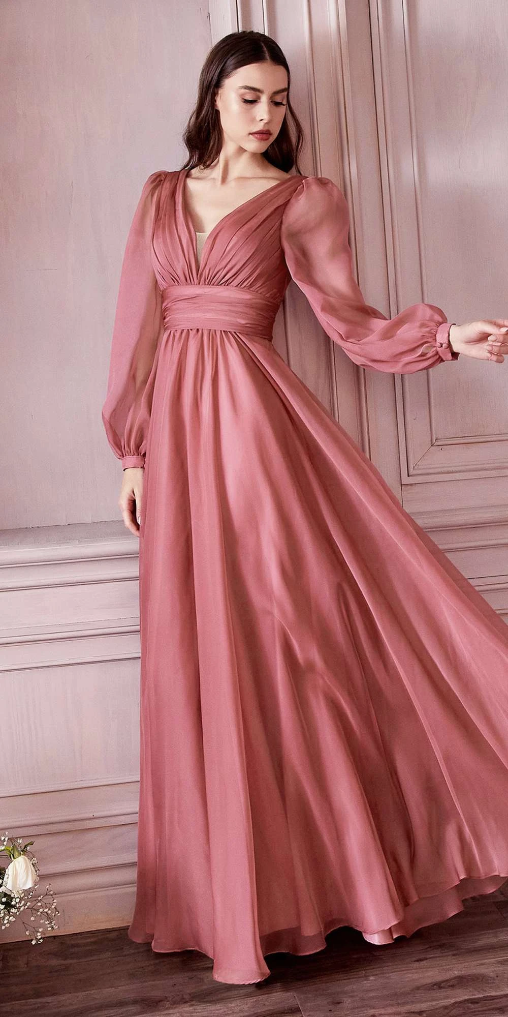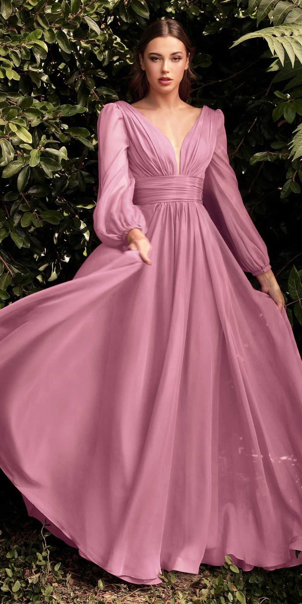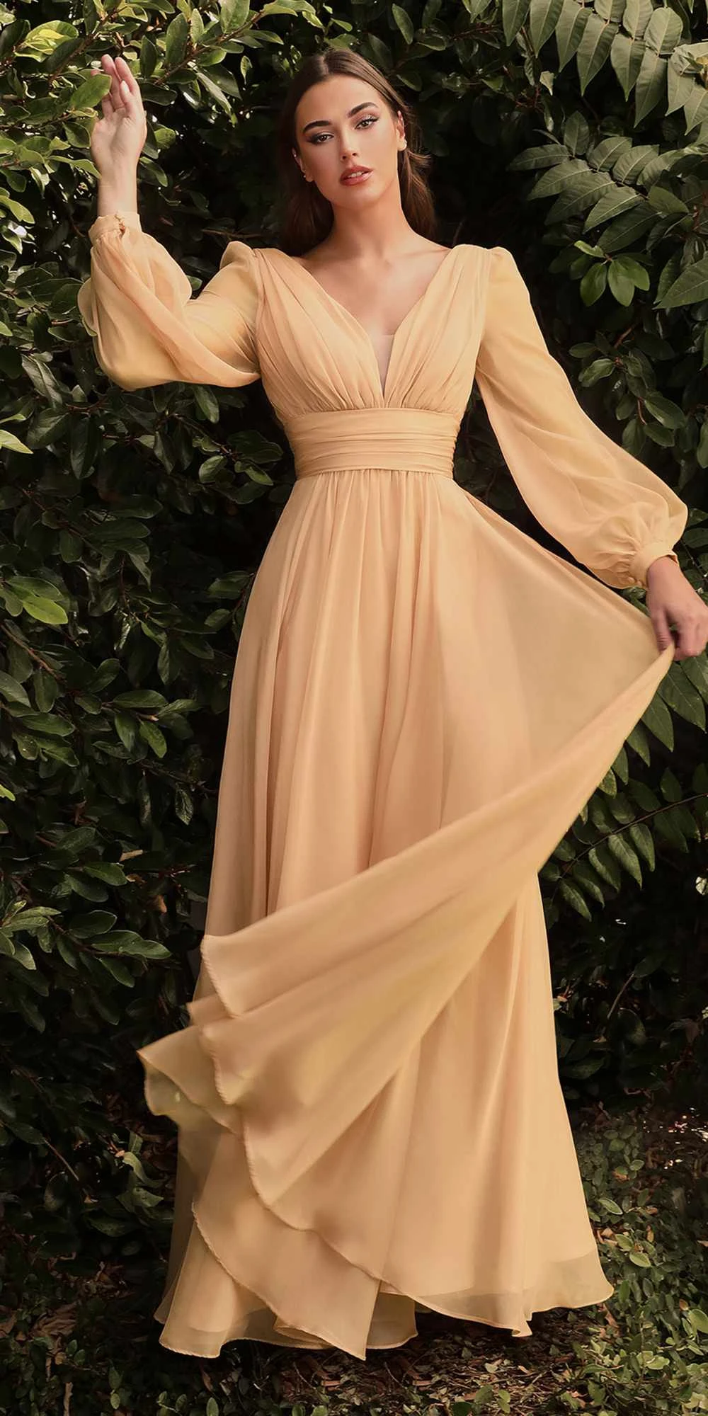 Imagine yourself in this beautiful floor length chiffon evening gown for your next formal event. This dreamy chiffon gown by Cinderella Divine CD0192 features a layered A-line skirt gathered at the waist. Sheer long sleeves drape the arms up to the gathered deep v-neckline bodice and ruched waistband. The back has a mid-opening allowing for bra strap coverage. An ideal full-length dress for red carpet events, pageant, prom or in any other formal occasions!