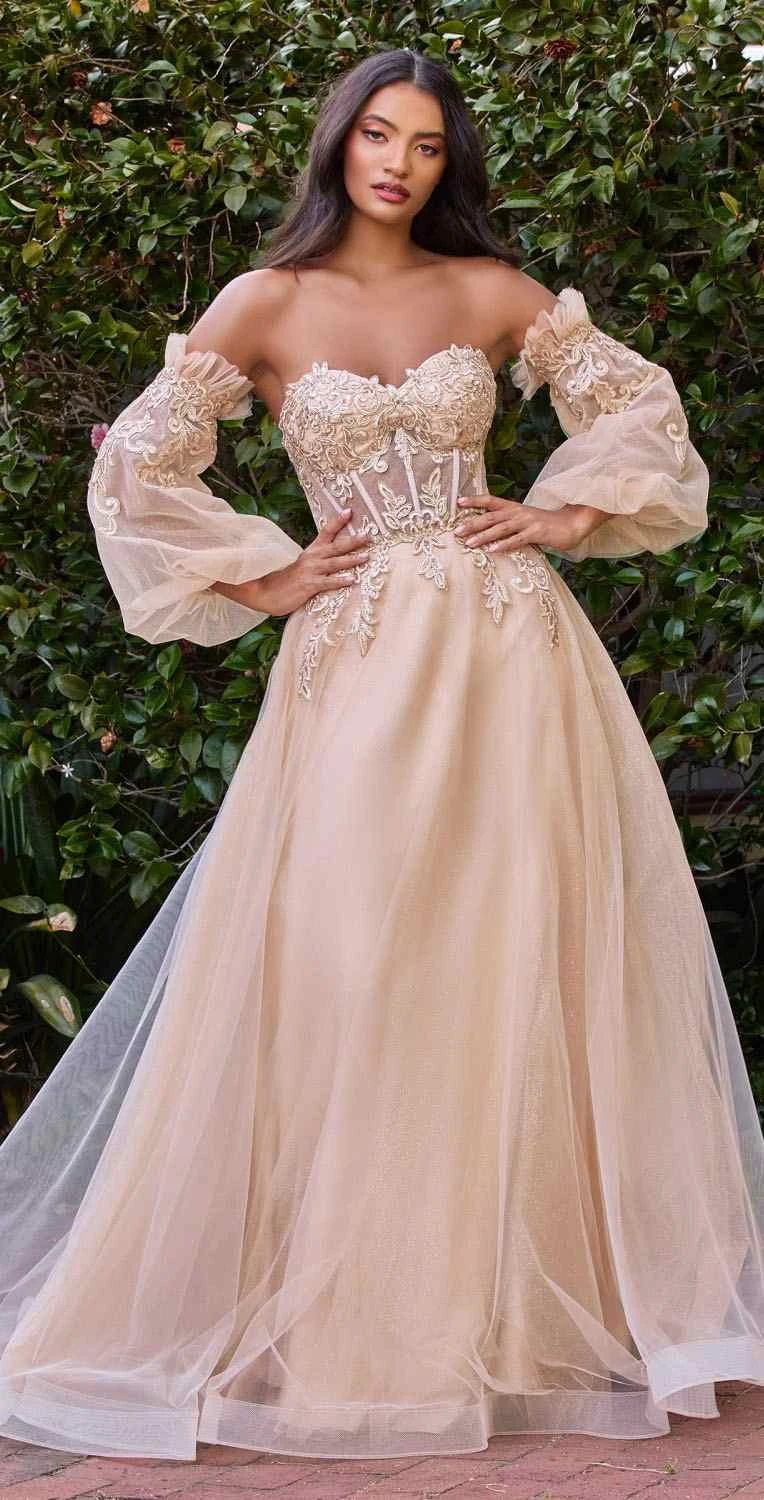 Imagine yourself in this long stunning formal evening A-line gown for your next special event! This floor length glittered tulle formal dress by Cinderella Divine CD948 sheer tulle corseted bodice, detachable off-the-shoulder blouson sleeves, and a lightly gathered skirt with flowing proportions. The bodice is strategically embellished at the bust, waist and sleeves. Its strapless sweetheart neckline is softened with a hand-cut lace edge. An ideal full length dress for red carpet events, pageant, prom or in any other formal occasions!