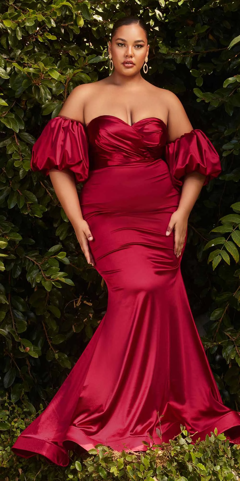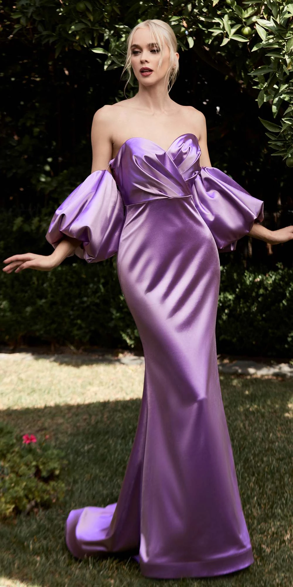 Imagine yourself in this stunning floor length fitted satin evening gown for your next formal event by Cinderella Divine CD983. This simple sophisticated stretch satin mermaid gown has a classic gathered sweetheart neckline and puff sleeve, on or off the shoulder as well as the option to remove completely. An ideal full-length dress for red carpet events, pageant, prom or in any other formal occasions!