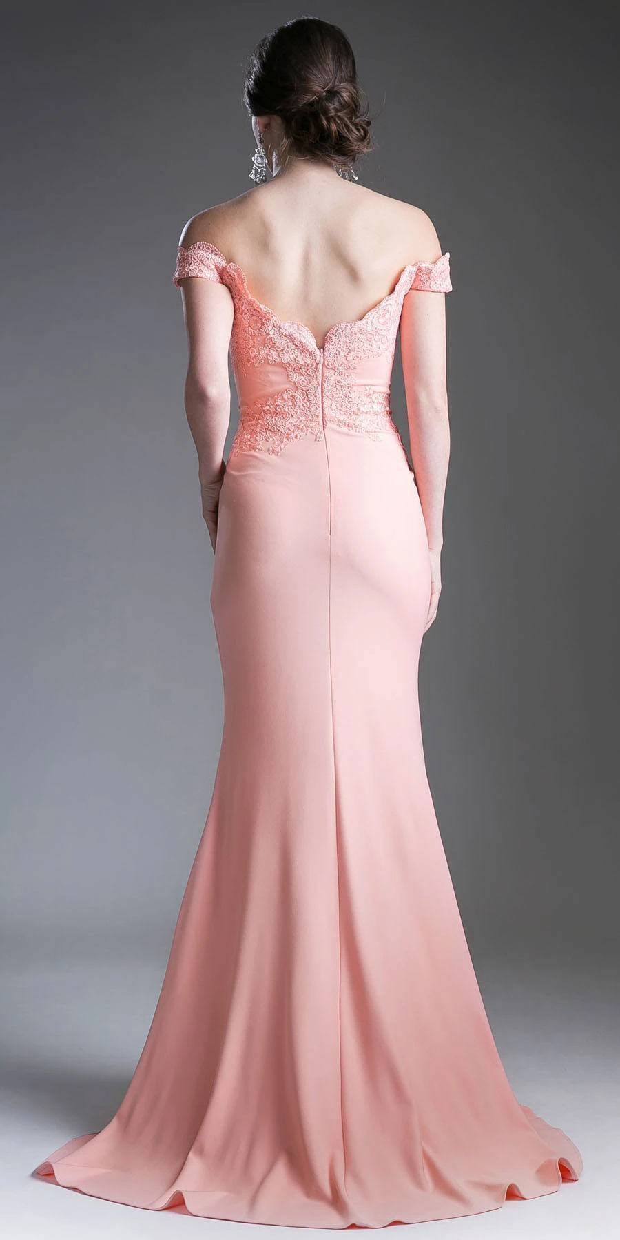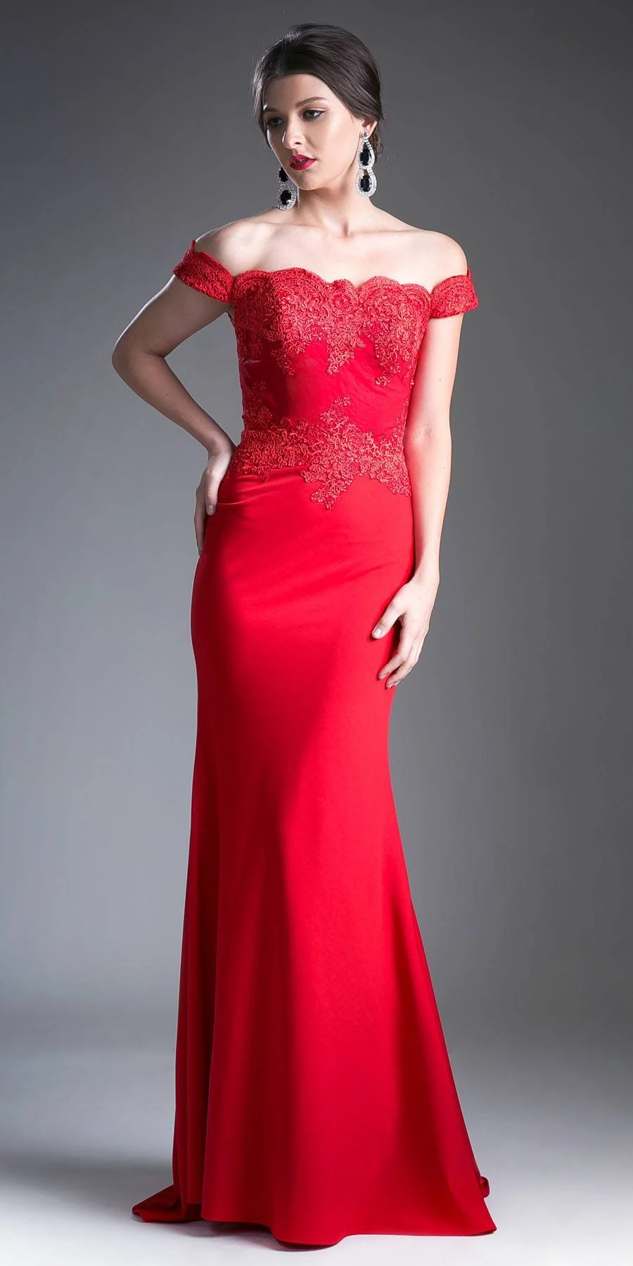 Celebrate your next event in this beautiful off shoulder evening gown from Cinderella Divine CF158, which features an applique bodice, fit and flare silhouette, V-shape zipper back and a sweeping train. An elegant outfit for red carpet, gala, pageant and in any other formal events.