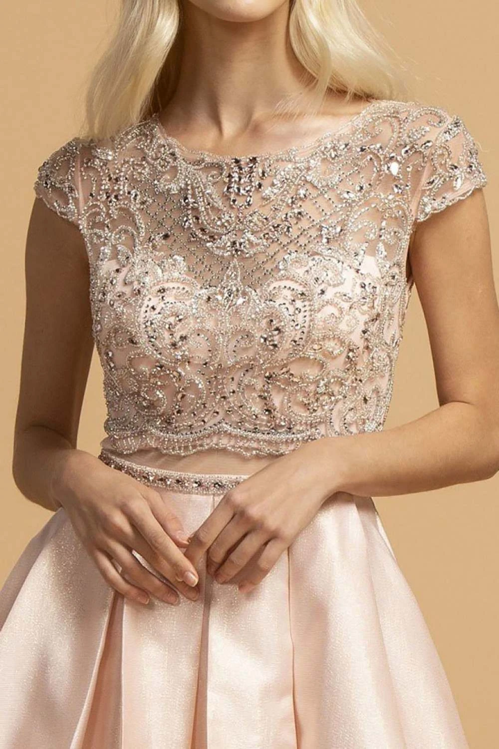CLEARANCE ITEM – Stand out and shine with this A-line silhouette long formal dress by Aspeed Design L2157. This short-sleeved gown features and illusion bodice with bead and rhinestones embellishments, sheer midriff and satin skirt with embellished waist and box pleating. An excellent attire for prom, red carpet event, awards night or in any other special occasions.