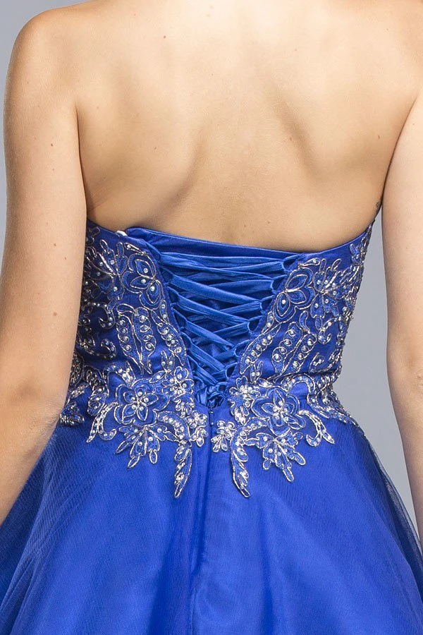 CLEARANCE ITEM – Enjoy the party wearing his wonderful short tulle homecoming dress by Aspeed USA S2040. Strapless sweetheart neckline with appliqued and bead embellishments, lace up back and curly hem tulle skirt. A fabulous outfit for homecoming, prom or sweet-sixteen party. Picture shown is in royal blue, but the dress available for sale is in champagne.