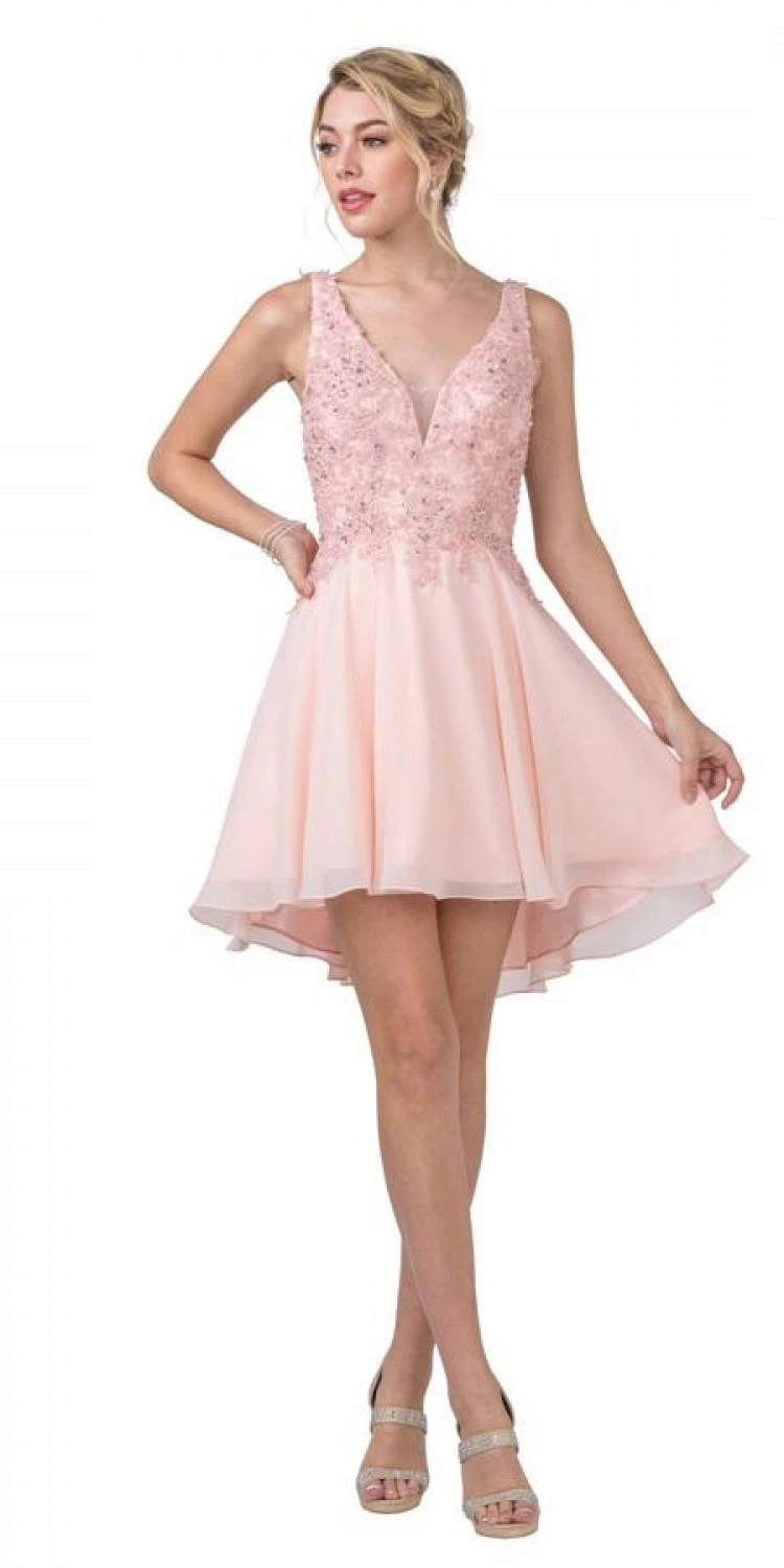CLEARANCE ITEM – Imagine yourself in this beautiful short party A-line dress made of chiffon with V-neck and back by Aspeed Design S2331. This flowy short dress features an applique decorated bodice topped with beads that adds some sparkles and sheer-inset front and sides of the bodice completed with a lovely chiffon skirt the flows elegantly. Perfect dress for homecoming, sweet-sixteen party, wedding guest of in any other special events!