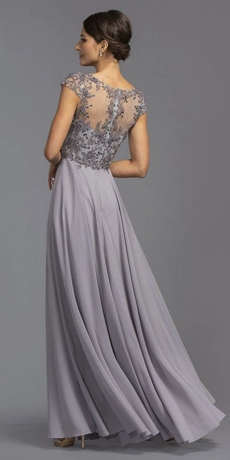 CLEARANCE ITEM – Elegant long formal dress by Aspeed USA M2100 with cap sleeves. The illusion sweetheart bodice is completely covered by a ravishing bead embellishments all through the back with zipper closure. A chiffon skirt that gracefully drops down the floor perfectly forms the A-line silhouette. This designer gown is a lovely outfit for weddings or any other formal occasions.