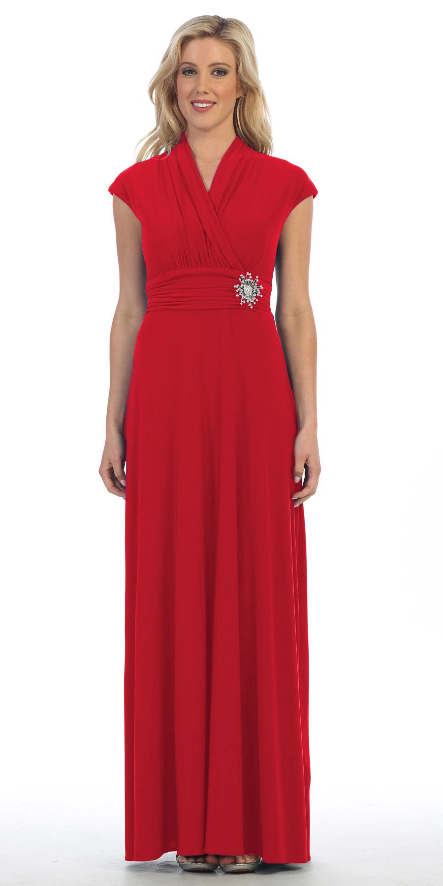 CLEARANCE ITEM – Step into this elegant full length formal dress in royal blue. Made with jersey, this long A-line dress in cap sleeves, features a V-shape neckline and shirred bodice and waist adorned with sparkling brooch!