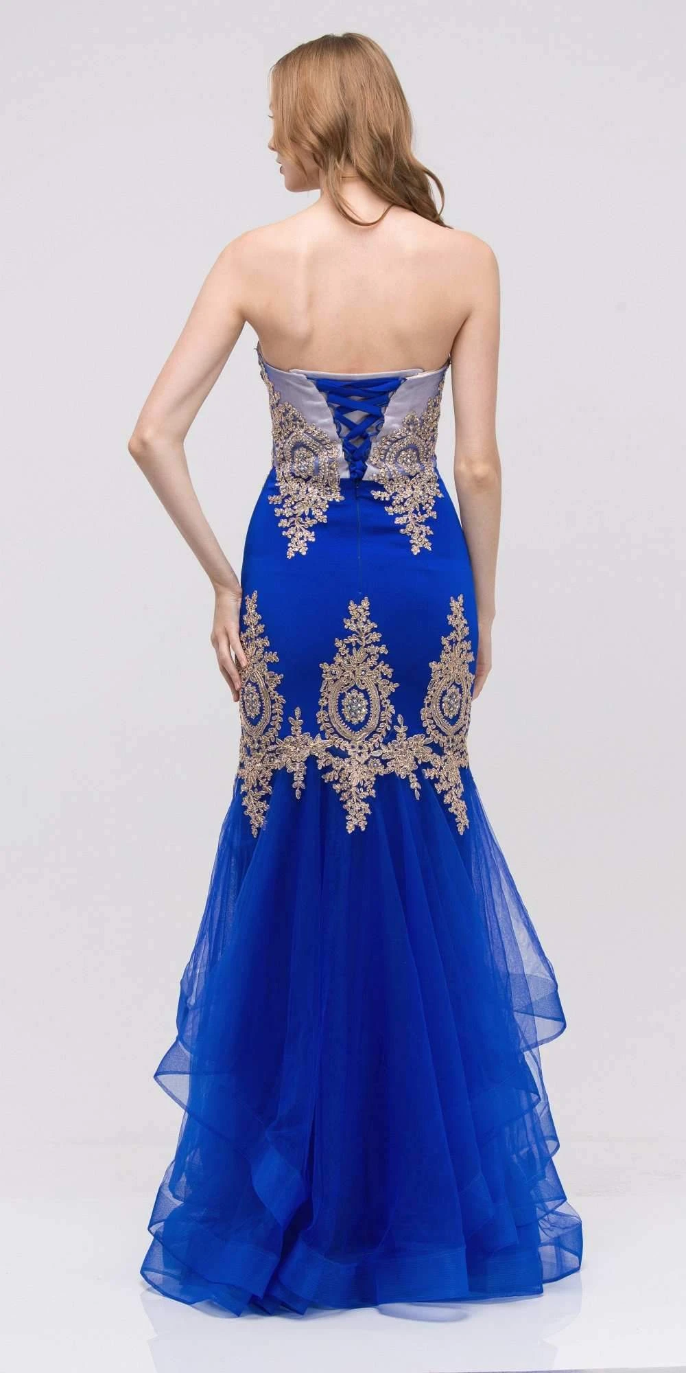 CLEARANCE ITEM – Shine and stand out in this stunning prom gown by Eureka Fashion 6009. This floor length satin mermaid dress is strapless with a sweetheart neckline and features an intricate silver appliques embroidery, layered skirt and lace up back. Perfect outfit for prom, red carpet and other formal occasions.