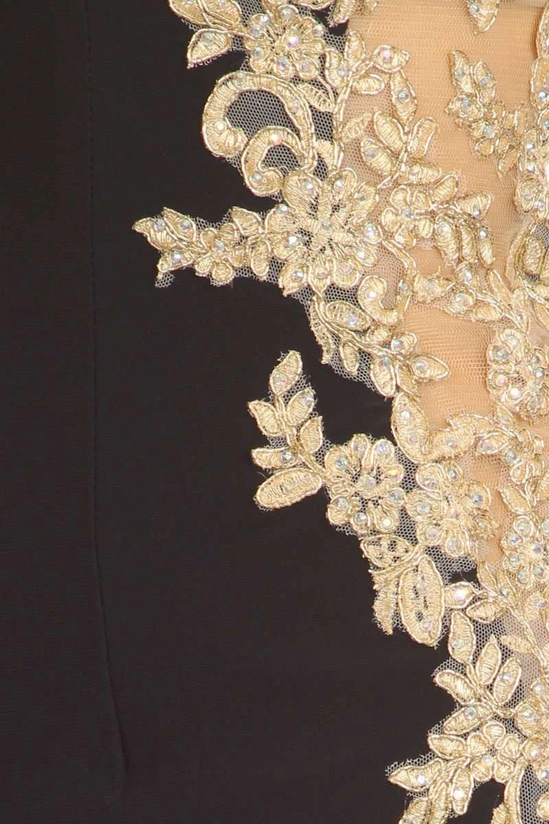 CLEARANCE ITEM – Gorgeous short prom dress with sheer panel on the sides covered with gold lace appliques and cut -out back. Bodycon sweetheart neckline short party dress. Long version available.