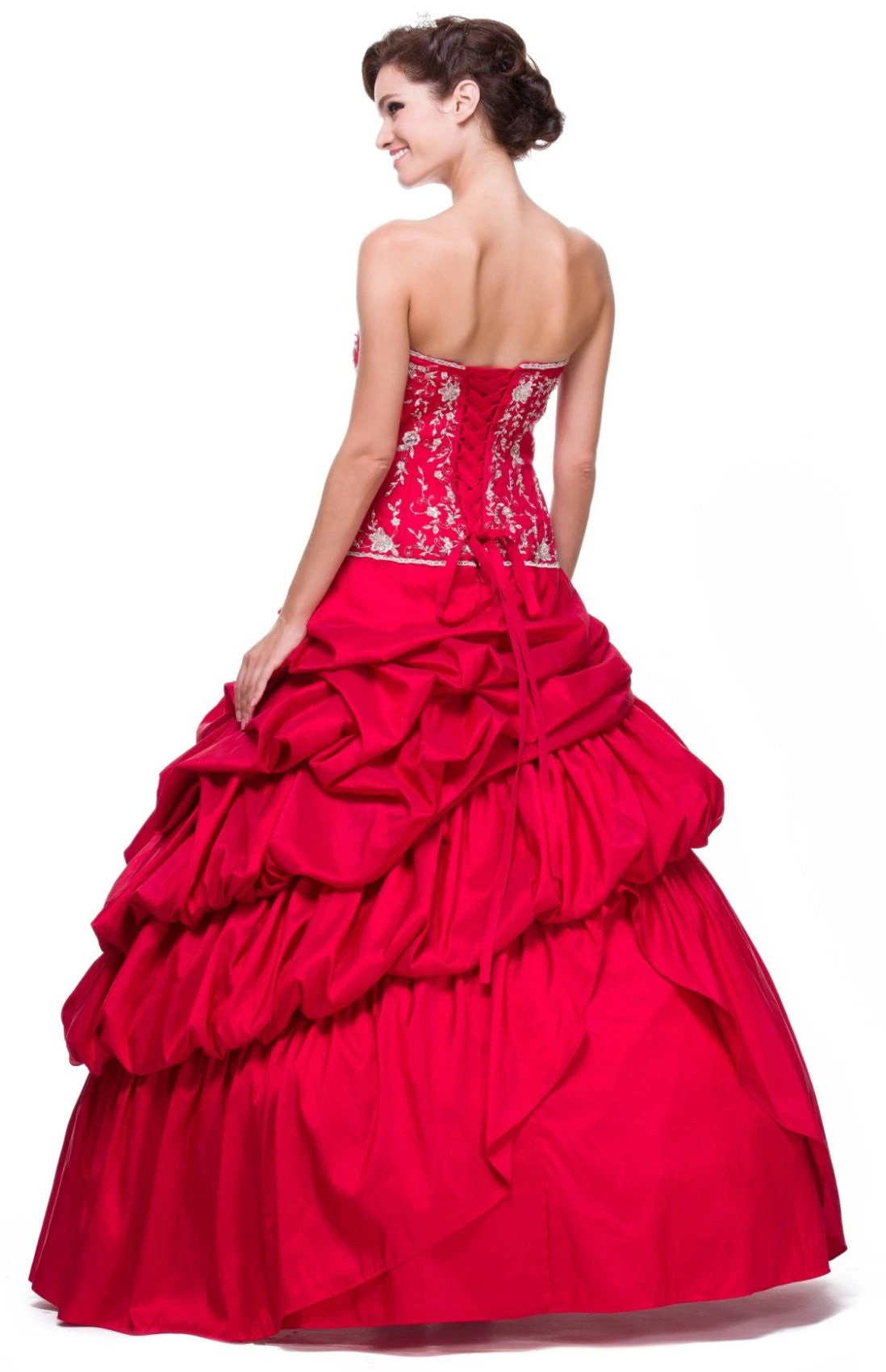 CLEARANCE ITEM – This quinceanera dress by Juliet 302 features luxurious taffeta and a sweetheart neckline, with a classic A-line silhouette and floor length skirt. The corset-style lace up tie back and embroidered bodice add intricacy, while poofy tiered ruffles provide a dramatic flourish. Look stunning for your special day.