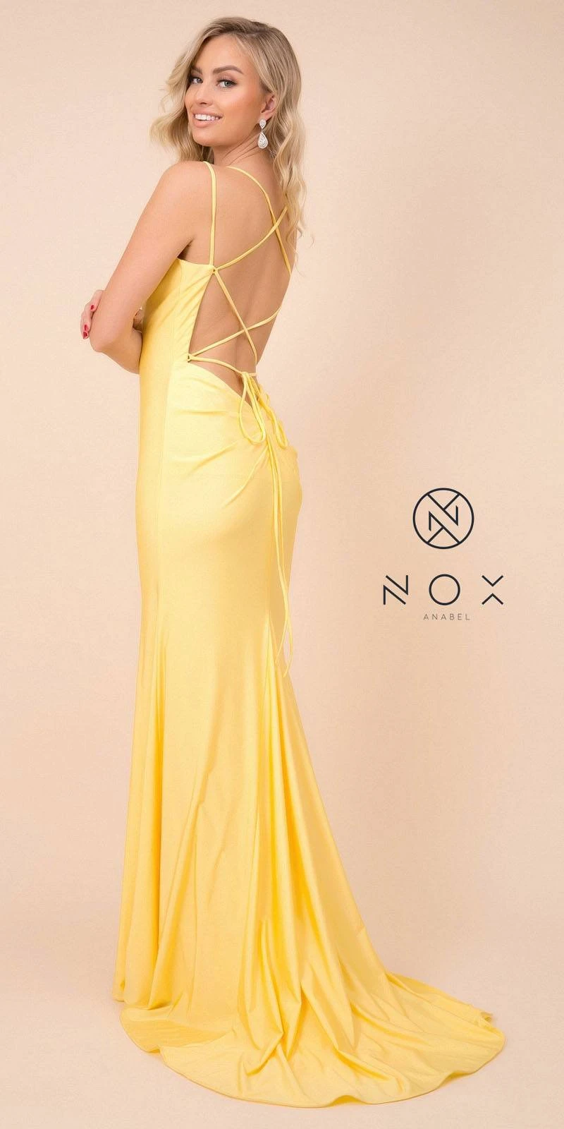 CLEARANCE ITEM – Be confidently beautiful with this made of satin mermaid silhouette long formal dress in yellow, size medium by Nox Anabel C301. This shiny long formal dress features a square neckline formed by the spaghetti straps delicately cascading over the shoulder and reveal an alluring strappy-back style. A sweeping train concludes the fabulous look, making this dress a perfect outfit for red carpet events, pageant, prom or in any other formal occasions! LAST ONE LEFT!