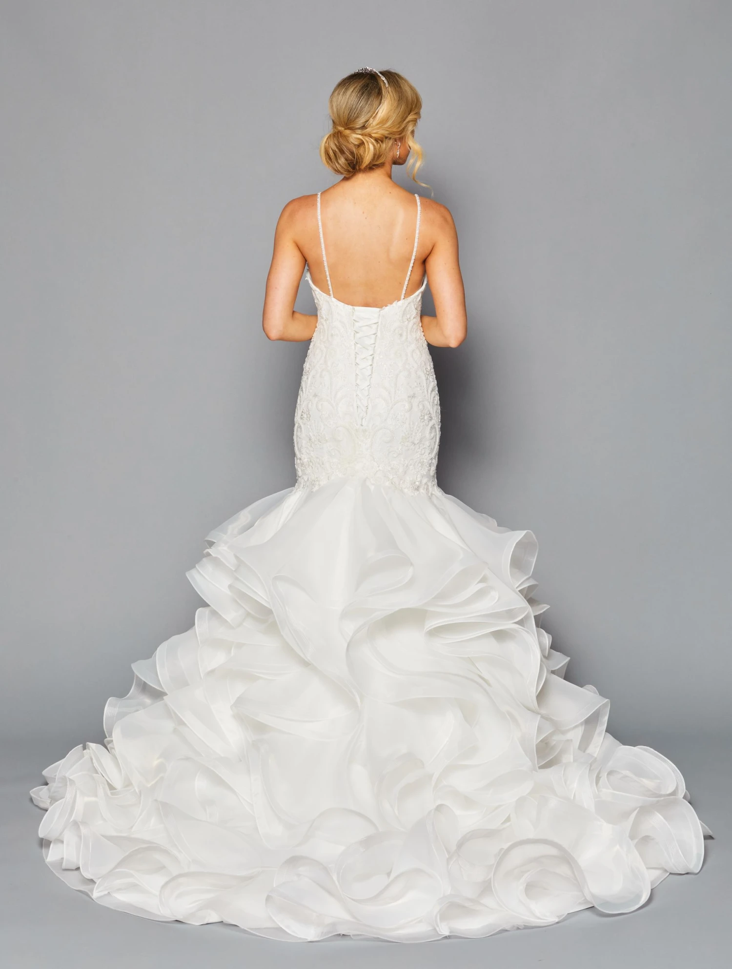 Imagine yourself wearing this beautiful floor length mermaid wedding gown for your upcoming wedding or debutante by DeKlaire Bridal 447. Spaghetti strap V-neckline mermaid wedding dress with organza ruffles skirts. A beautiful wedding dress to make your day feel extra special!
