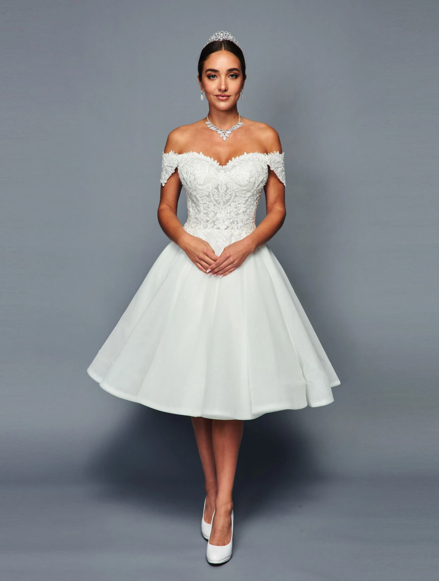 Imagine yourself wearing this beautiful knee length A-line wedding gown for your upcoming wedding by DeKlaire Bridal 467. Short off the shoulder A-line wedding dress with beaded lace sequins applique. Skirts length: 25″ from waist. A beautiful wedding dress to make your day feel extra special!
