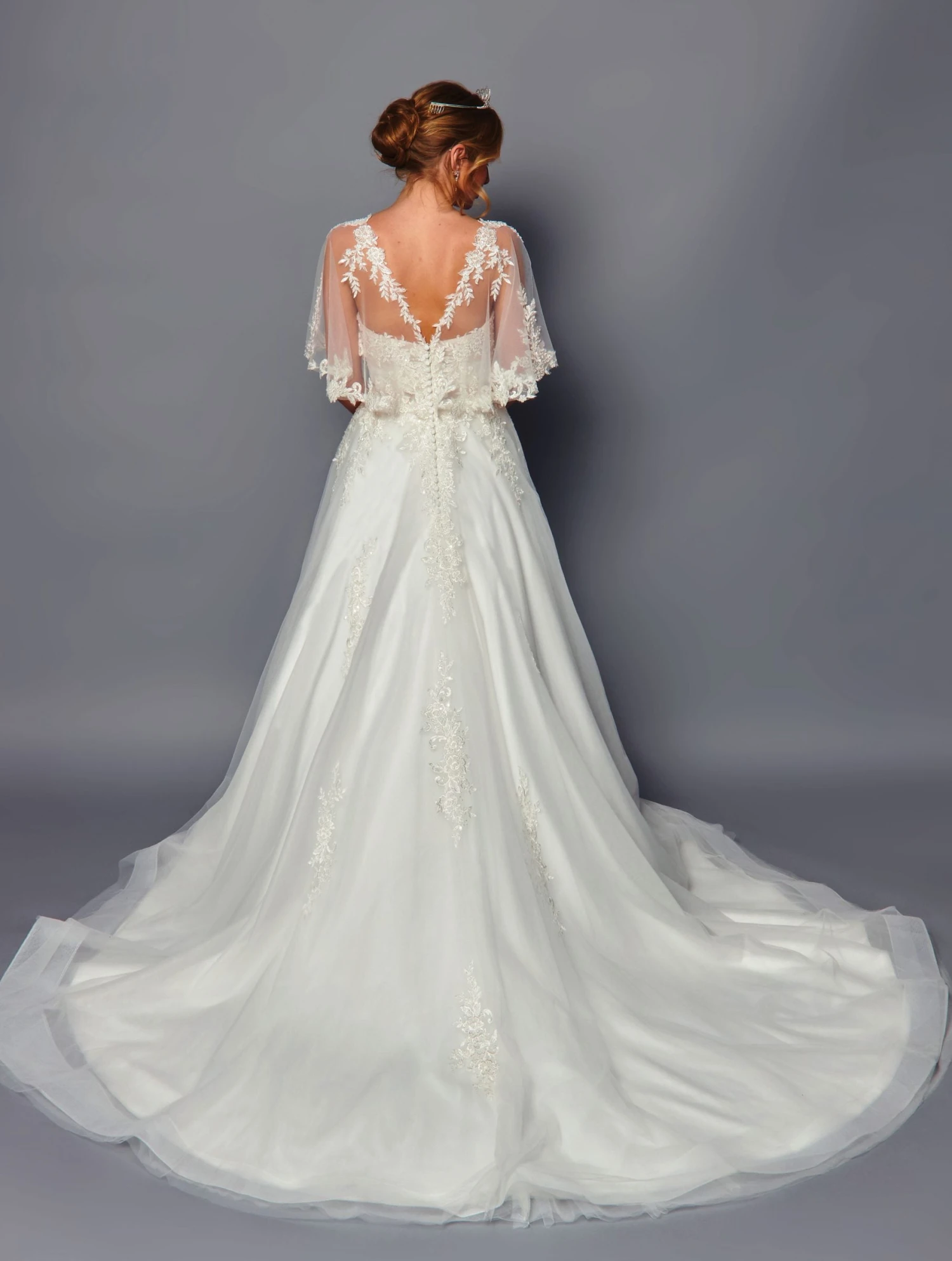 The DeKlaire Bridal 488 wedding dress offers elegant sophistication with its V-neckline and illusion tulle butterfly 1/2 sleeve shawl. The A-line silhouette and court train add a touch of romance, while the beaded sequins applique and summary back details provide a subtle touch of sparkle. Perfect for a timeless and glamorous bride.