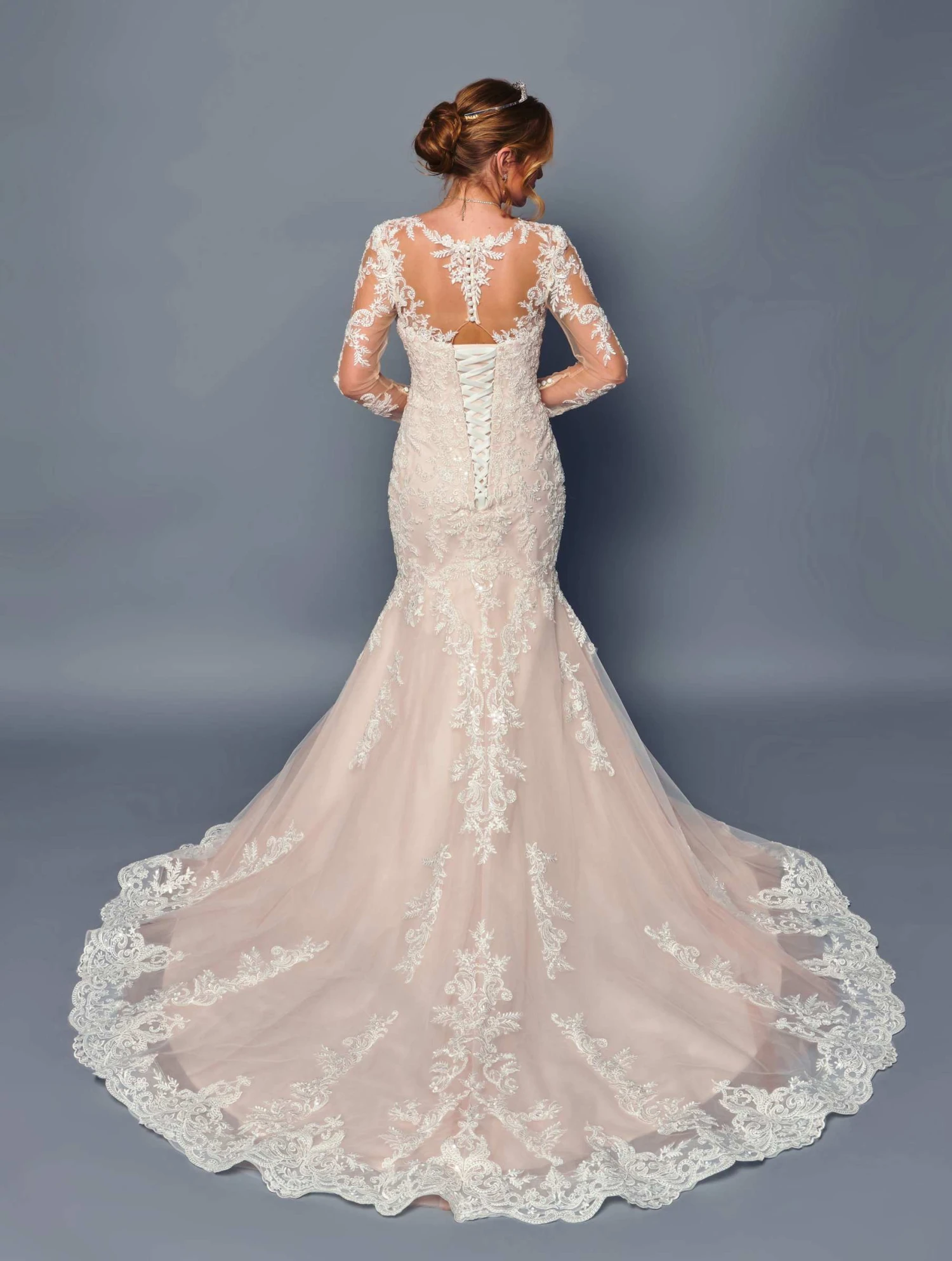 The DeKlaire Bridal 491 wedding dress features an elegant queen Anne neckline and nude illusion long sleeves. Its trumpet/mermaid silhouette creates a stunning figure while the corset boned bodice provides a secure fit. The beaded lace sequins applique adds a touch of glamour, and the illusion corset lace-up tie back completes the look. Perfect for a sophisticated and modern bride.