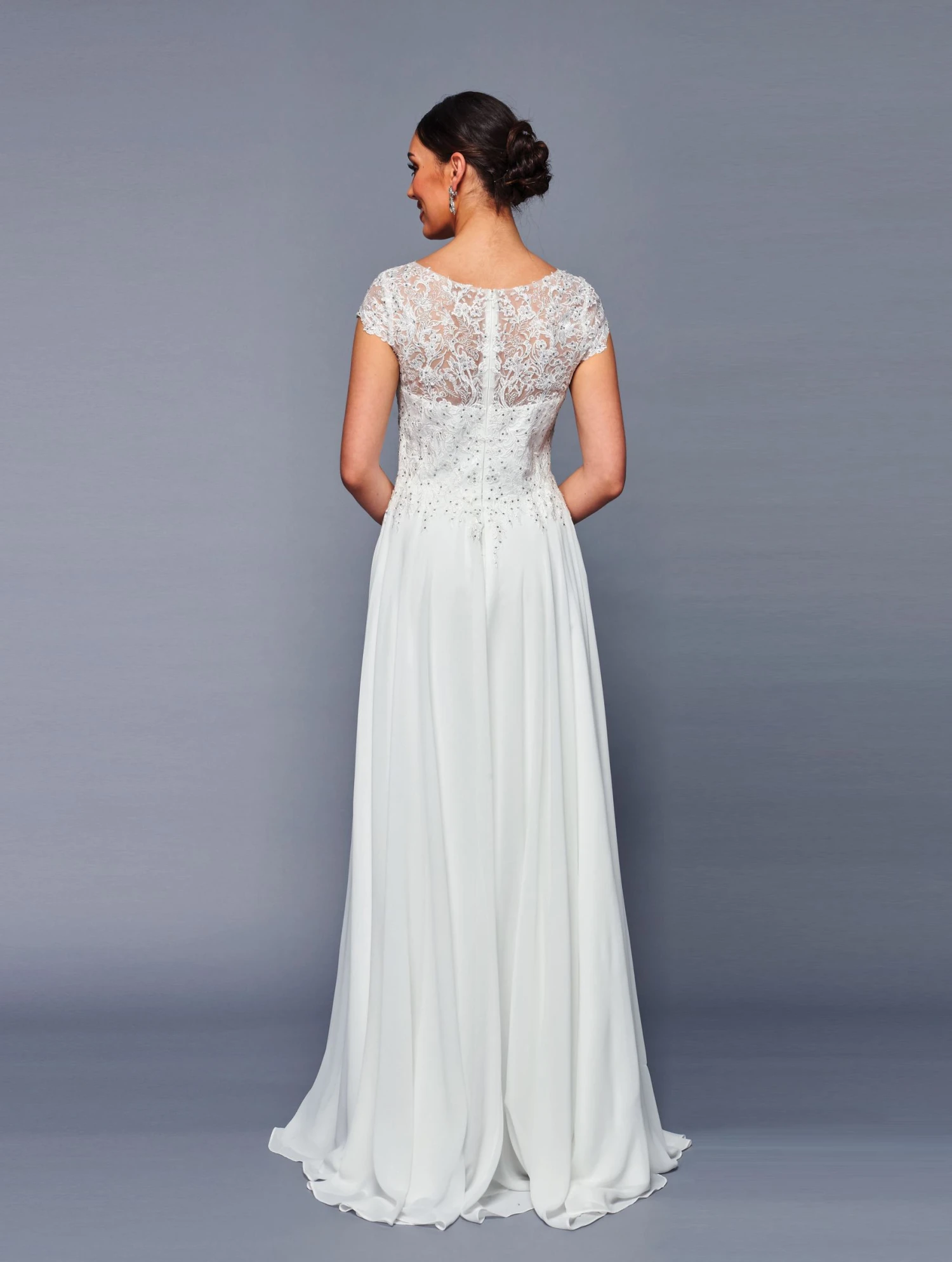 Be the picture of elegance in the Deklaire Bridal K311. This A-line gown with a bateau neckline and wide straps is perfect for the mother of the bride. The intricate beaded lace and embroidered applique add a touch of glamour, while the back zipper and floor length design provide comfort and ease. Complete the look with the sophisticated cap sleeves.
