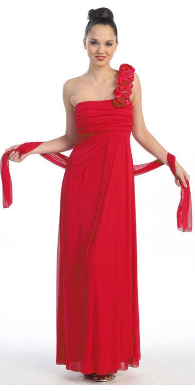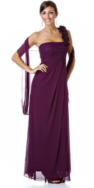 Designed to provide supreme elegance and an envious fitting, this long column dress in orange is perfect for a bridal party. The single strap of this one-shoulder dress comes highlighted with elaborate rosette motifs, while a straight neckline with subtle pleats define the fitted bodice. An empire waistline holds a floor-length skirt with utmost grace and a sleek stole highlights the overall beauty of this long dress.