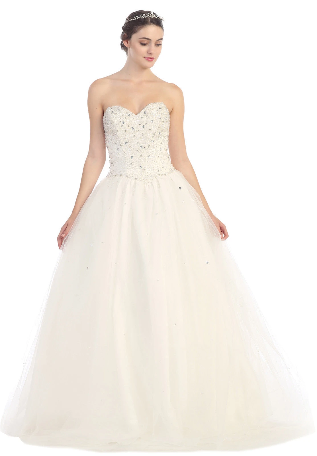A cotillion party deserves a gorgeous companion like this flared ball gown to make an impressive entry. This strapless attire is bedecked with rhinestone accents scattered in an abstract manner on the corset bodice for a radiant look. A sweetheart neckline and a natural waistline flank the fitted bodice from both sides, while a beautifully flared skirt reaches up to floor-length. A short sleeve mesh shrug/bolero jacket is also included to add elegance to this gorgeous attire.