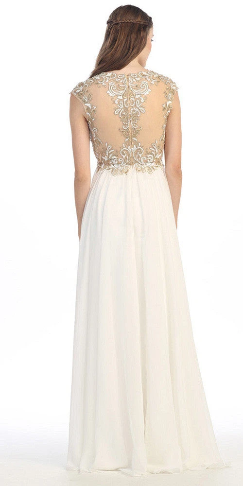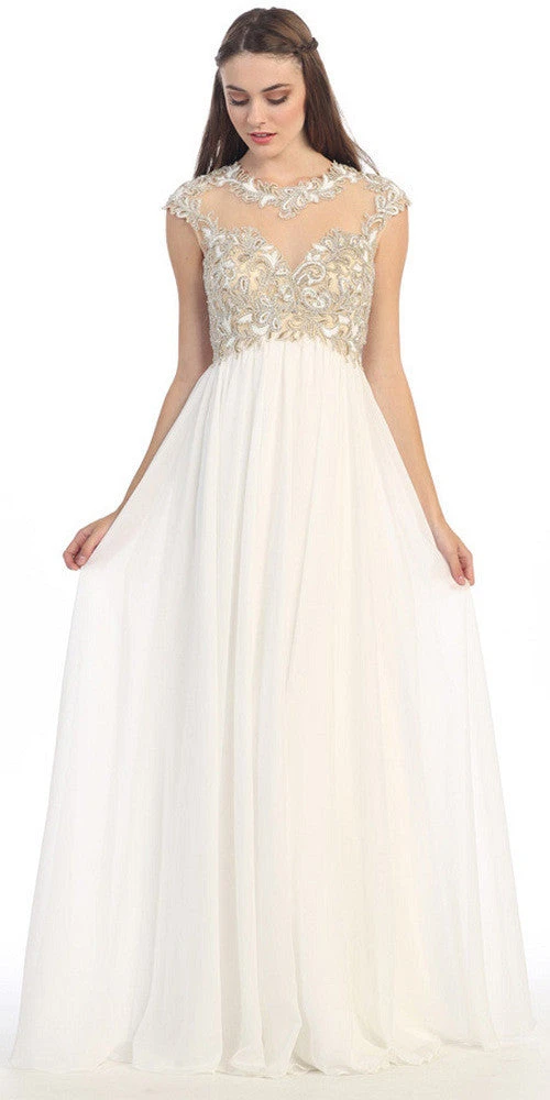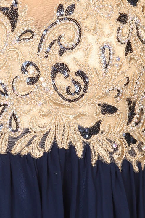Enjoy the evening in this beautiful long formal gown in Navy Blue. This A line chiffon dress is full length with cap sleeves and features an exquisite lace embroidered and beaded top and empire waist. The illusion neckline and back gives this dress an elegance like no other.