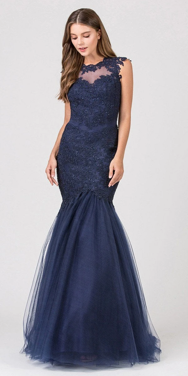 Be gorgeously beautiful with this mermaid silhouette formal dress by Eureka Fashion 4510. This floor length gown features cap sleeves with a illusion neckline, made with delicate sequins-lace fabric. A curve hugging dress features a cut out back.