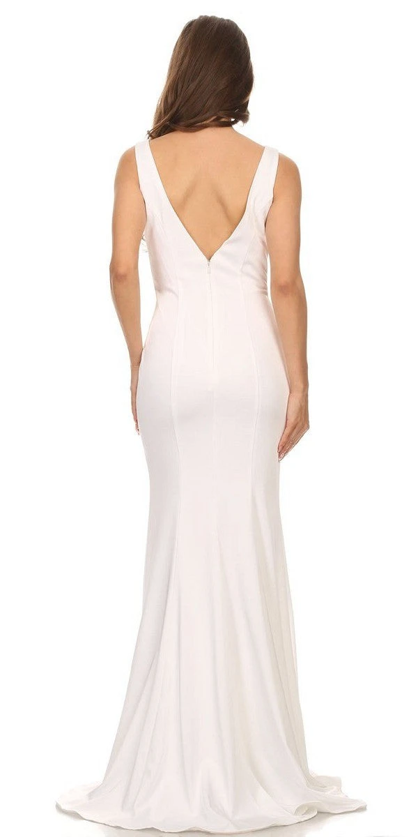 Mermaid silhouette floor length prom dress with plunging v-neckline, sheer inset and V-shape open back. Stunning off white stretchy satin formal dress. Short version available.