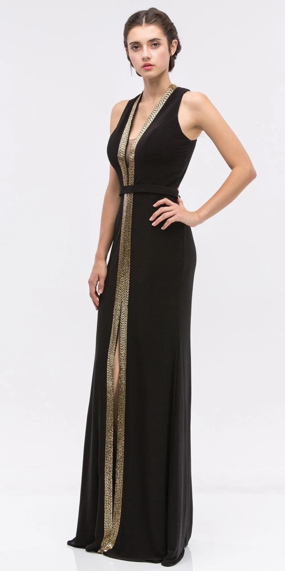 Plunging neck with golden trim cascading down to the hem, sheer inset and a high front slit. Belted fit and flare formal gown with cut-out back.