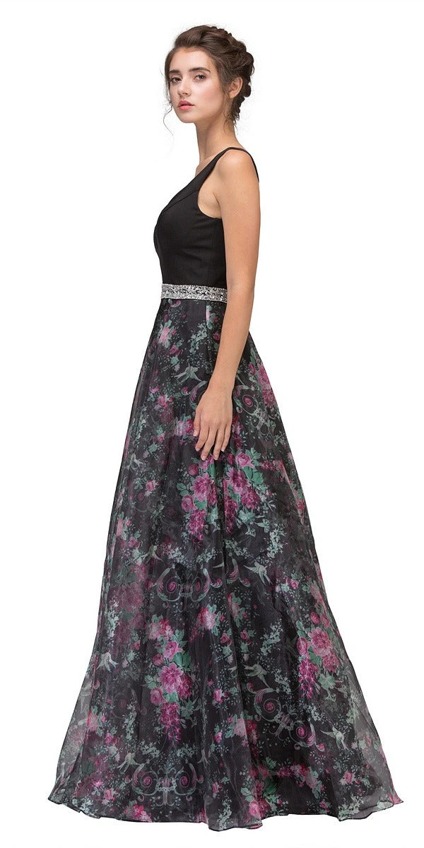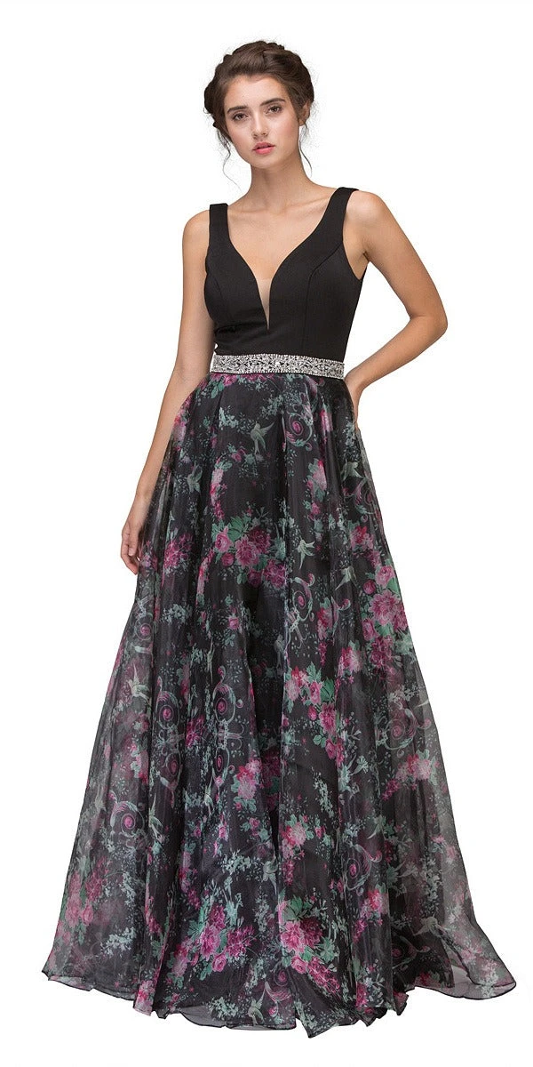 Floor length floral printed prom gown by Eureka Fashion 7020. This A-line gown has a solid black sleeveless top, v-neckline with sheer inset and a mesh floral printed skirt with dazzling beads and sequins embellishes the waistline.