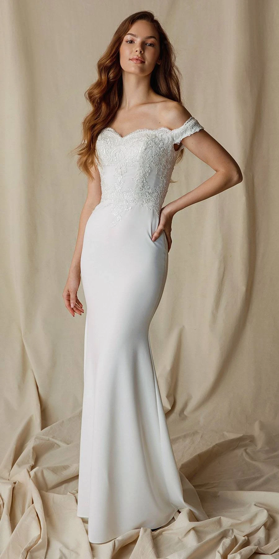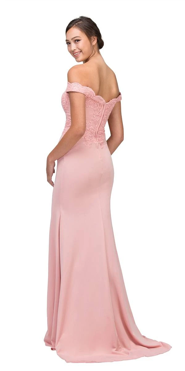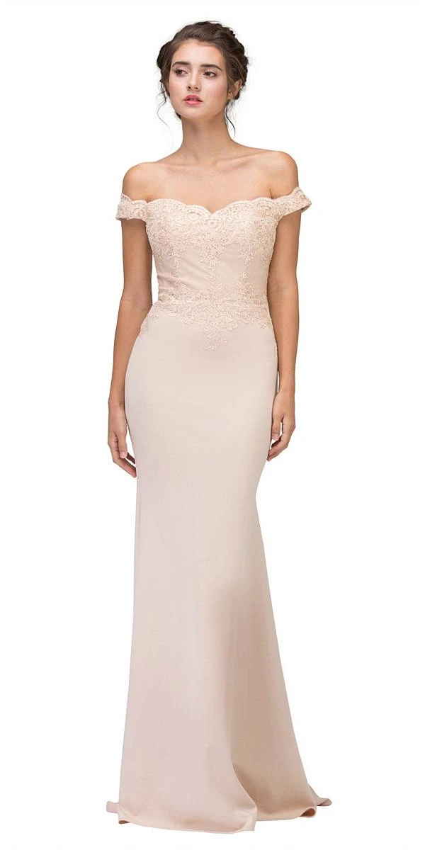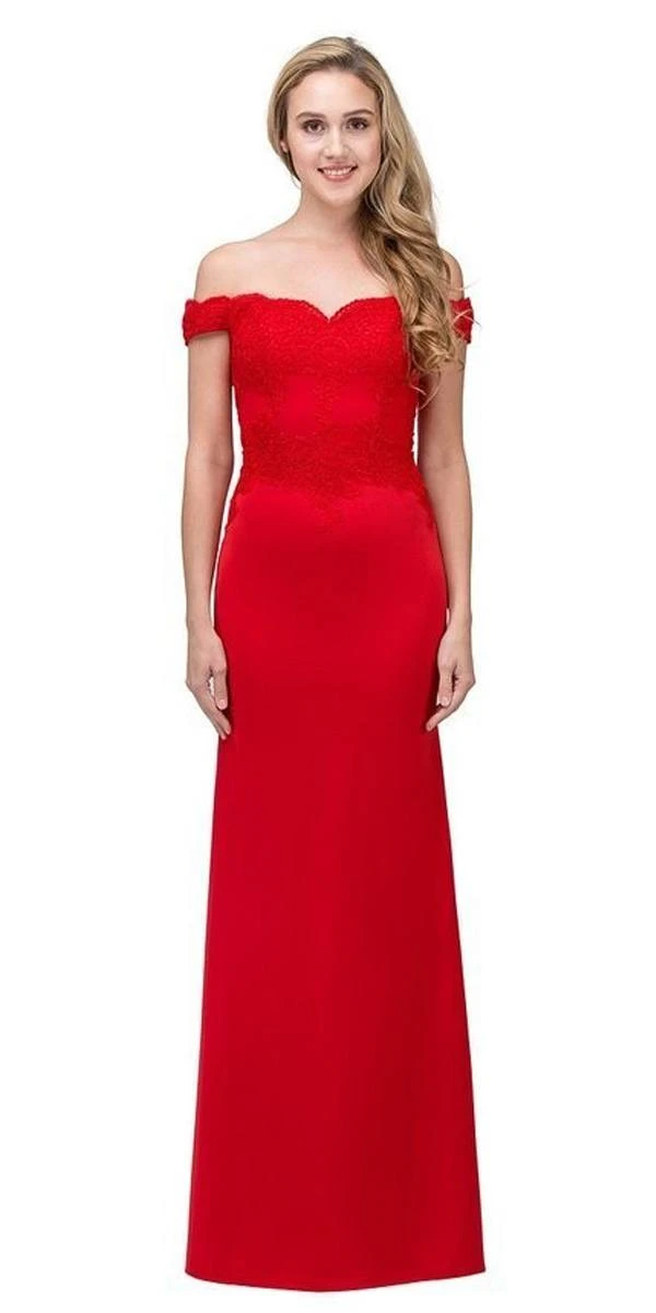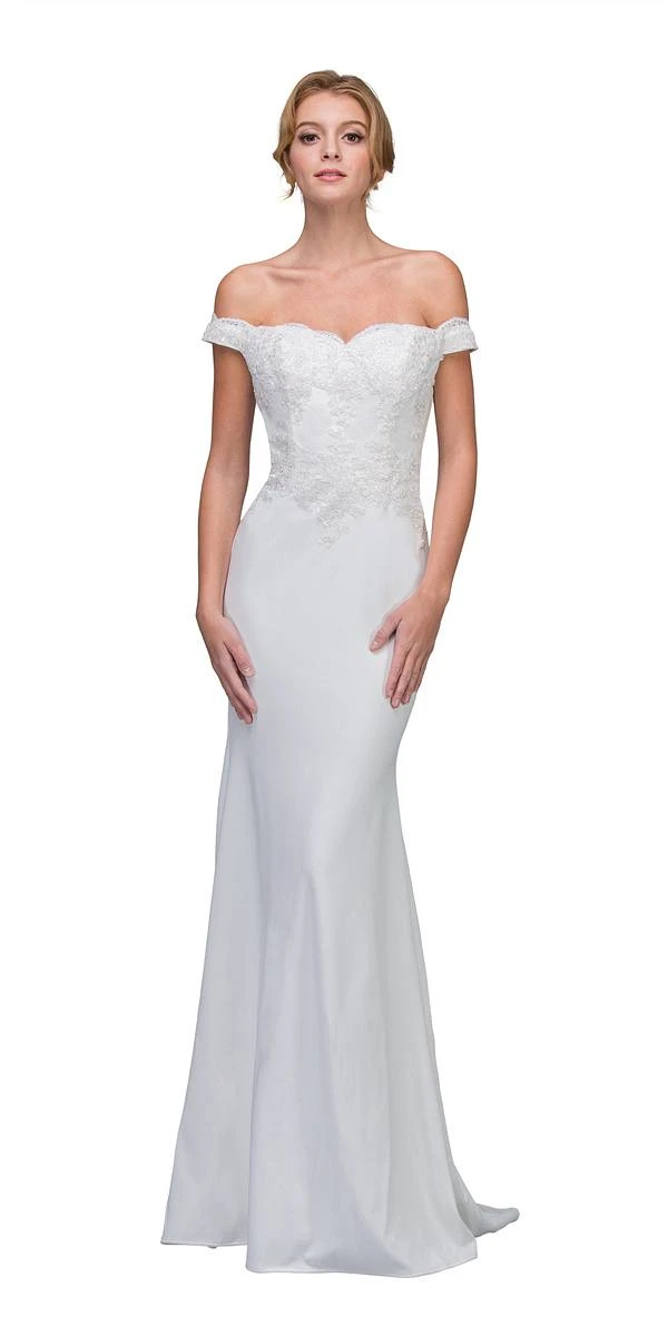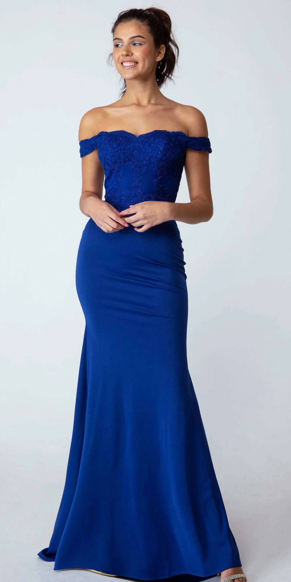 Stunning off-the-shoulder floor length formal dress by Eureka Fashion 7100. This floor length dress features a lace appliques decorating the fitted bodice with a scallop semi-sweetheart neckline. This mermaid silhouette gown has a figure flattering princess cut made of ITY heavy jersey material. A designer dress ideal for prom, pageant, awards night or any other special occasions.