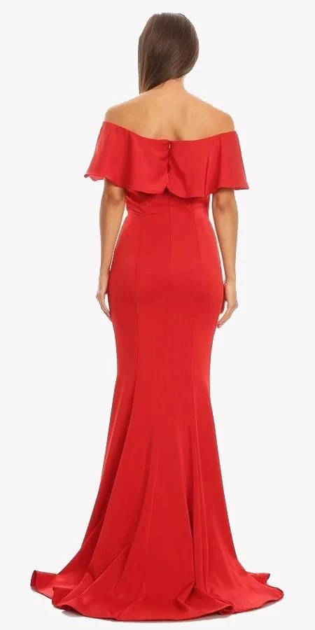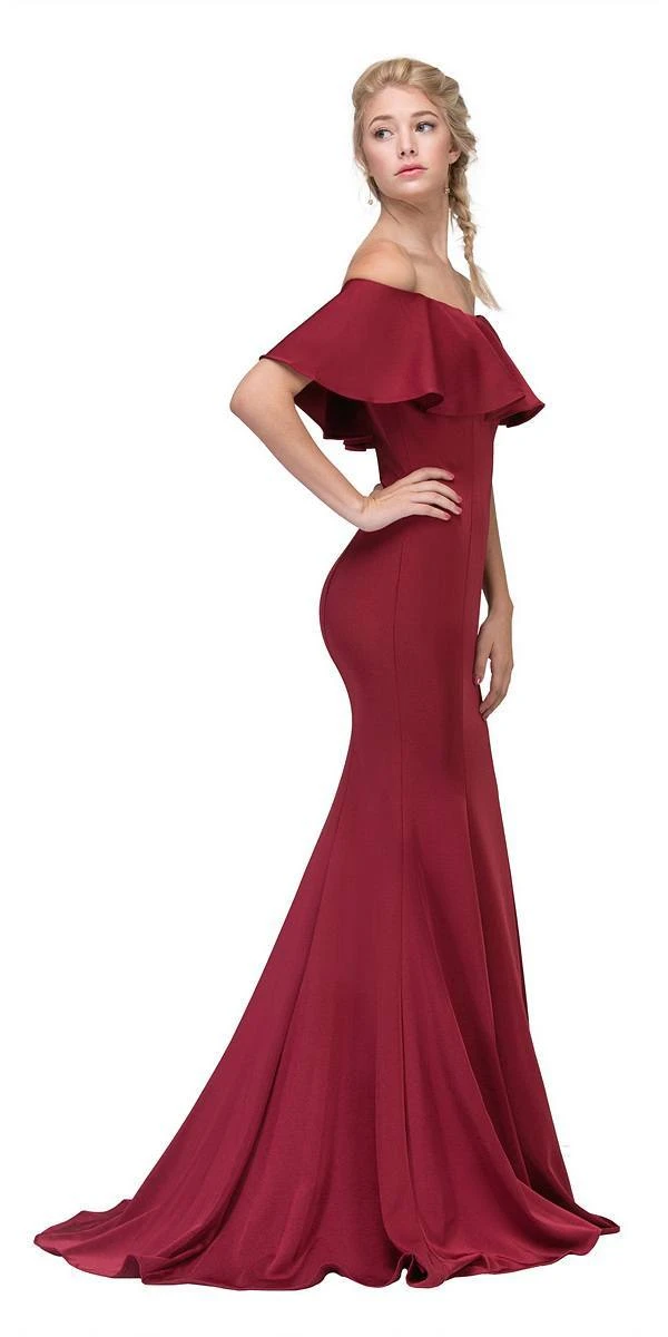 Shine and stand out in this remarkable floor length evening prom gown by Eureka Fashion 7113. This floor length stretch satin mermaid silhouette dress features an off shoulder with ruffled bodice. A sophisticated gown in any formal occasions.