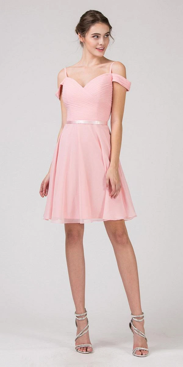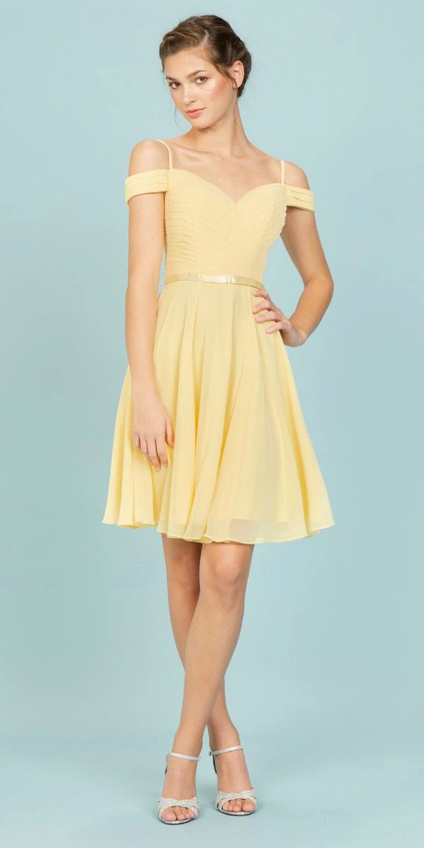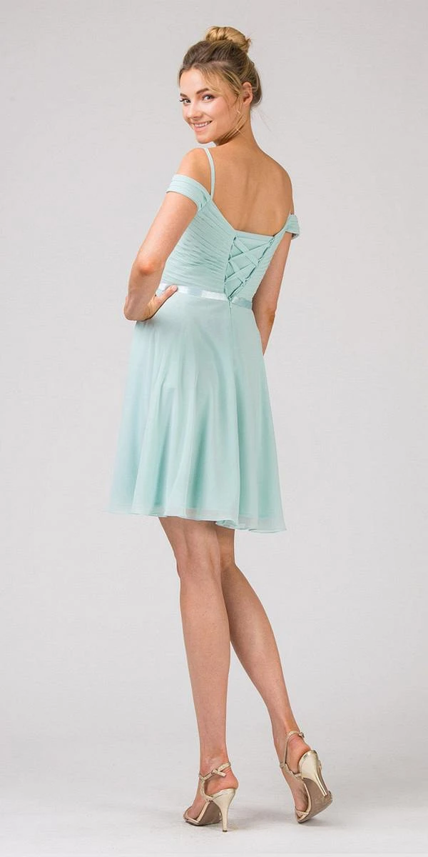 Gorgeous cold-shoulder style short dress with a-line silhouette, lace-up back, sweetheart neckline and ruched bodice accented with thin satin band that emphasize the natural waist. A lovely dress in lilac by Eureka Fashion 7622, ideal outfit for bridesmaids, homecoming, graduation party,off-the-shoulder, cocktail party or any other special celebrations. Click here to see long version look of this dress.