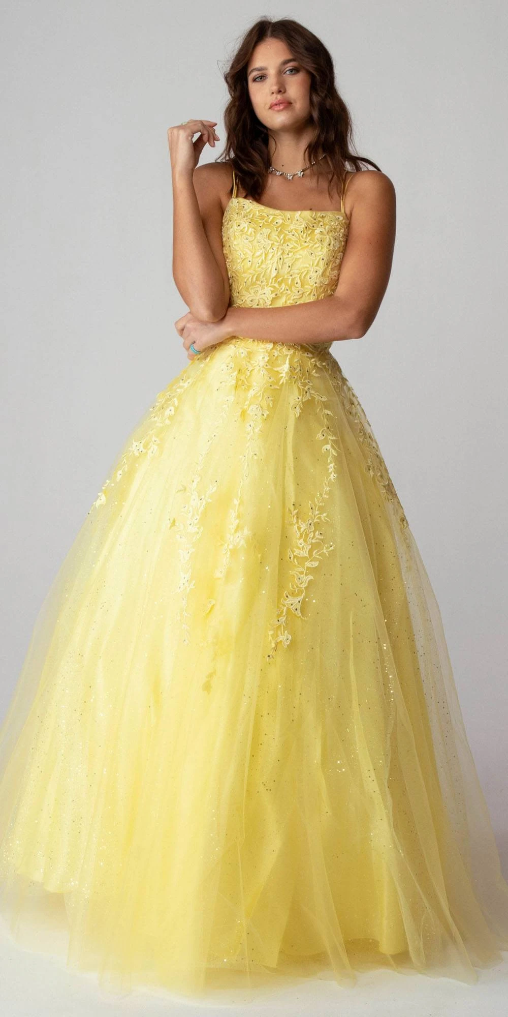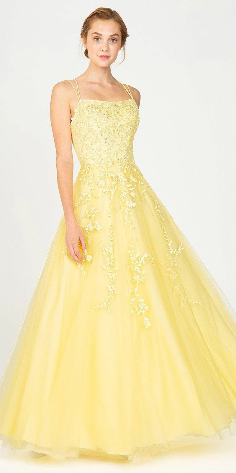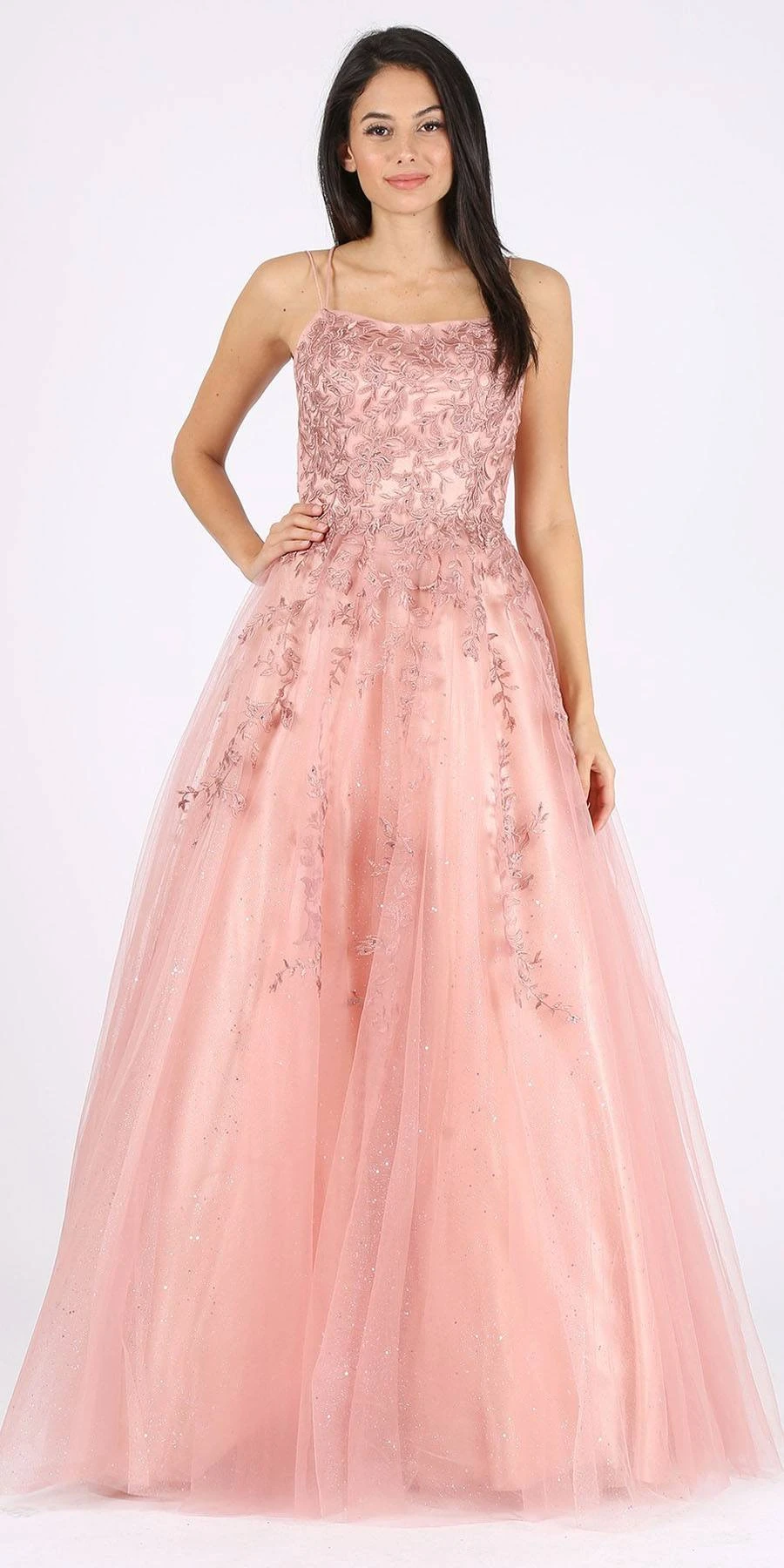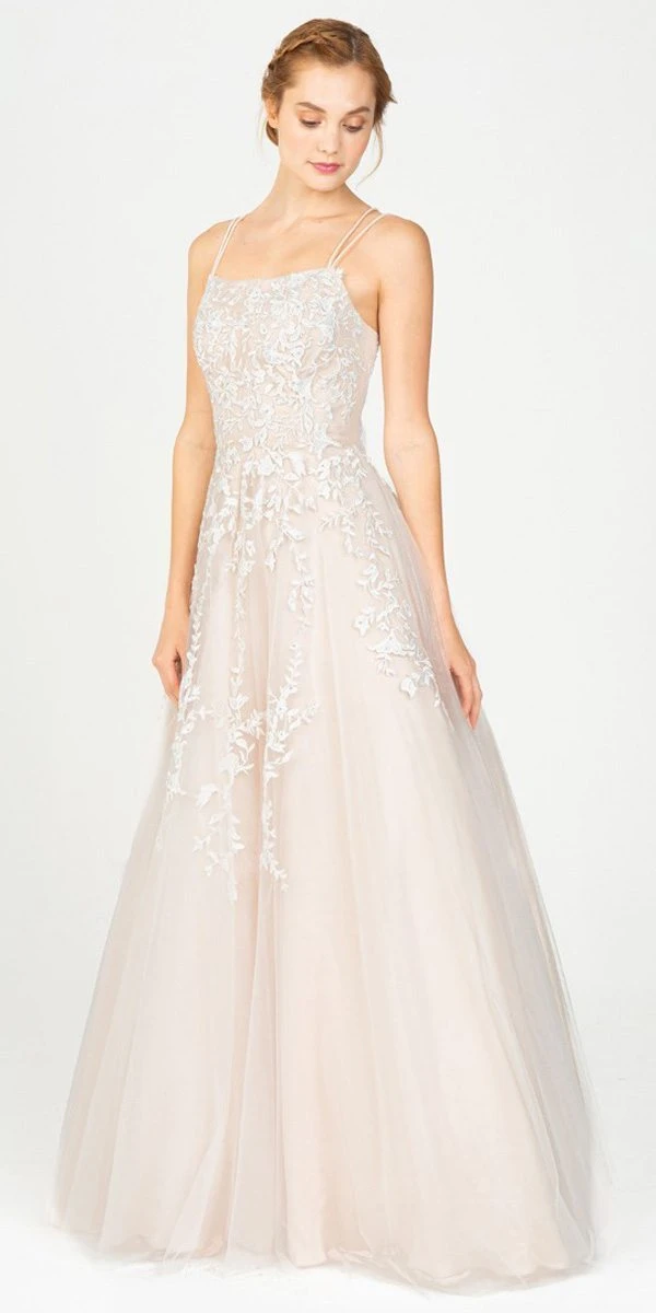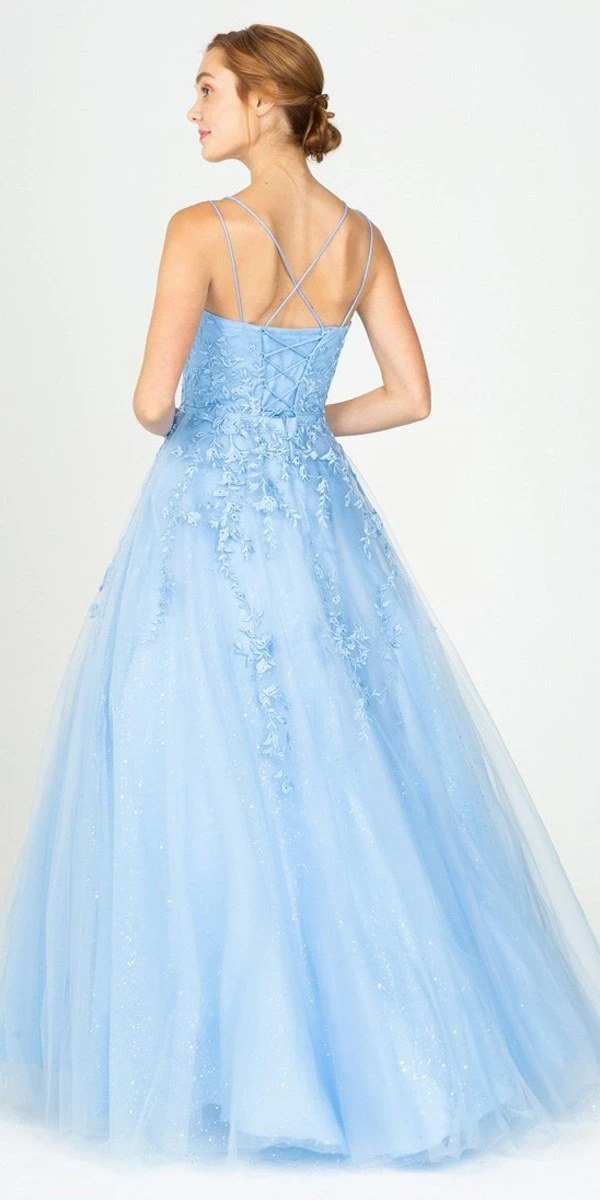 This ball gown by Eureka Fashion 9757 is decorated with 3D lace embroidery with bone support on the bodice that beautifully cascades onto the ball skirt. Supported by a double spaghetti straps from front to back creating a corset lace-up and strappy back design, this mesh skirt has a glitter shimmer underlay and is a perfect dress for red carpet events, pageant, prom or in any other formal occasions! *Does not include gloves.