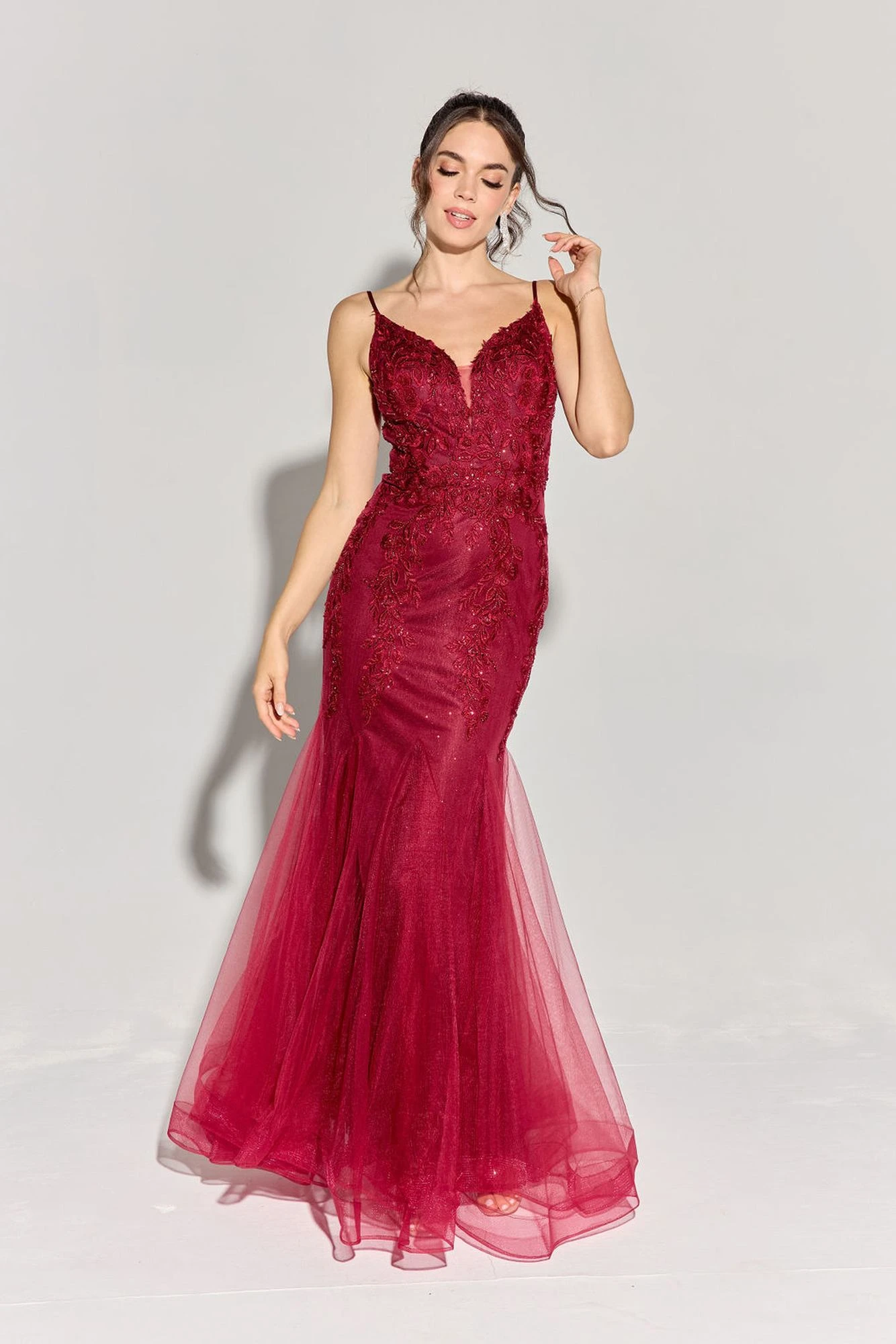 This floor-length gown by Eureka Fashion 9998 features a fitted mermaid godet silhouette that elegantly contours the body. The dress showcases a lace-embellished floral bead design, complemented by a glitter tulle skirt that adds subtle shimmer. A V-neckline with a zipper back and delicate spaghetti straps lead to an open U-back, combining sophistication with modern allure. Ideal for formal occasions, this gown offers a refined balance of intricate detailing and flattering structure.