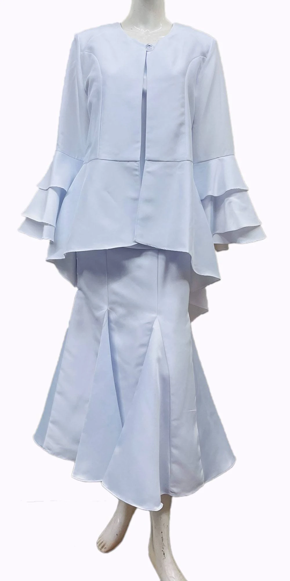 Elevate your special occasion attire with Hosanna Design 5167, 3-piece dress set, made in the USA. The 3D tiered bell sleeves add elegance to this modest and comfortable outfit, while the elastic waistband ensures a perfect fit. Includes a long sleeve jacket, sleeveless top, and tea length skirt for a fashionable and versatile look. Plus size available.