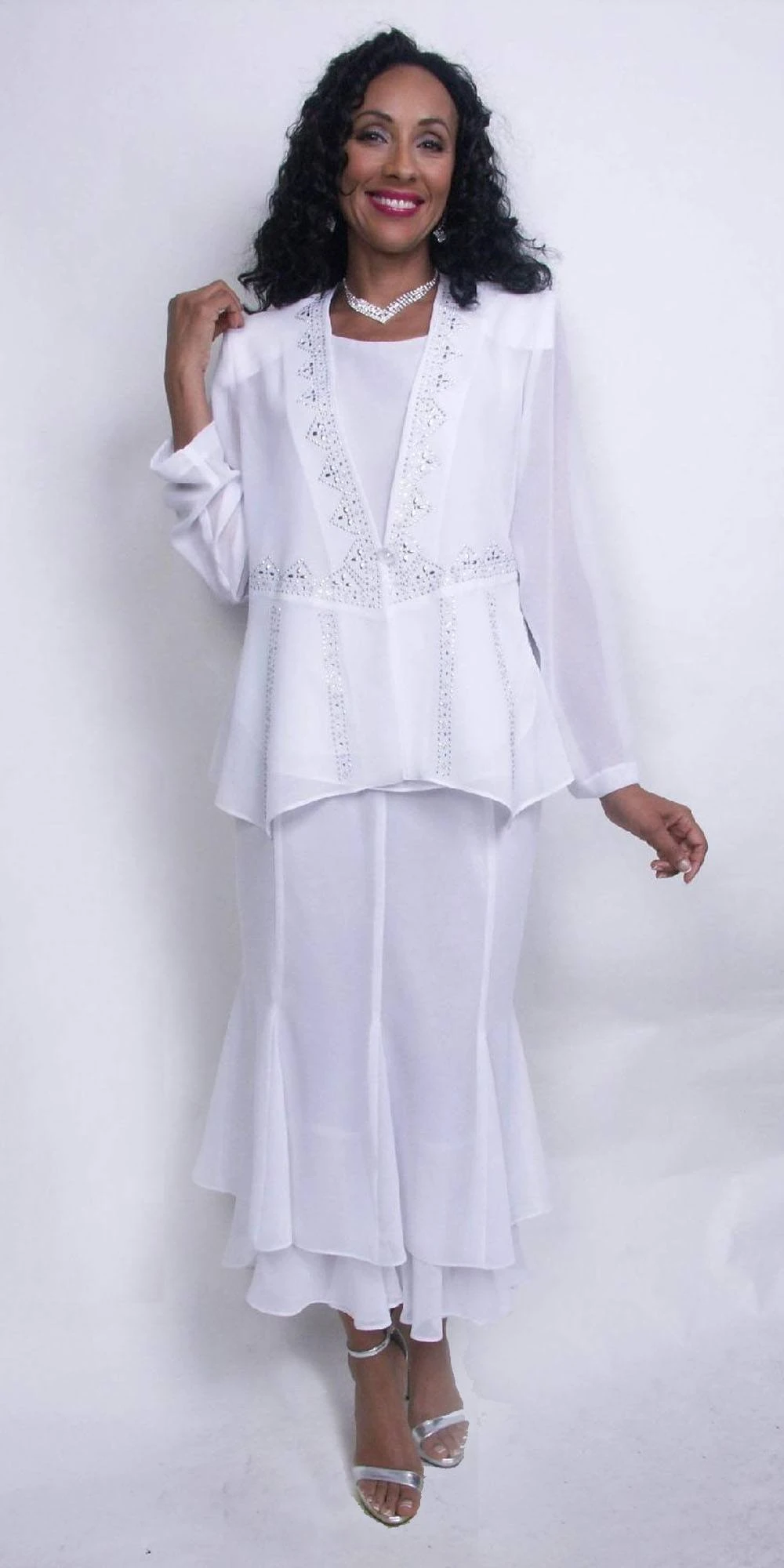 This 3-piece tea length dress set by Hosanna 5523 is a comfortable and modest choice for any special occasion. Made in the USA, it features silvery beaded embellishments and an elastic waistband for a flattering fit. The set includes a long sleeve jacket, sleeveless top, and asymmetrical tea length skirt.