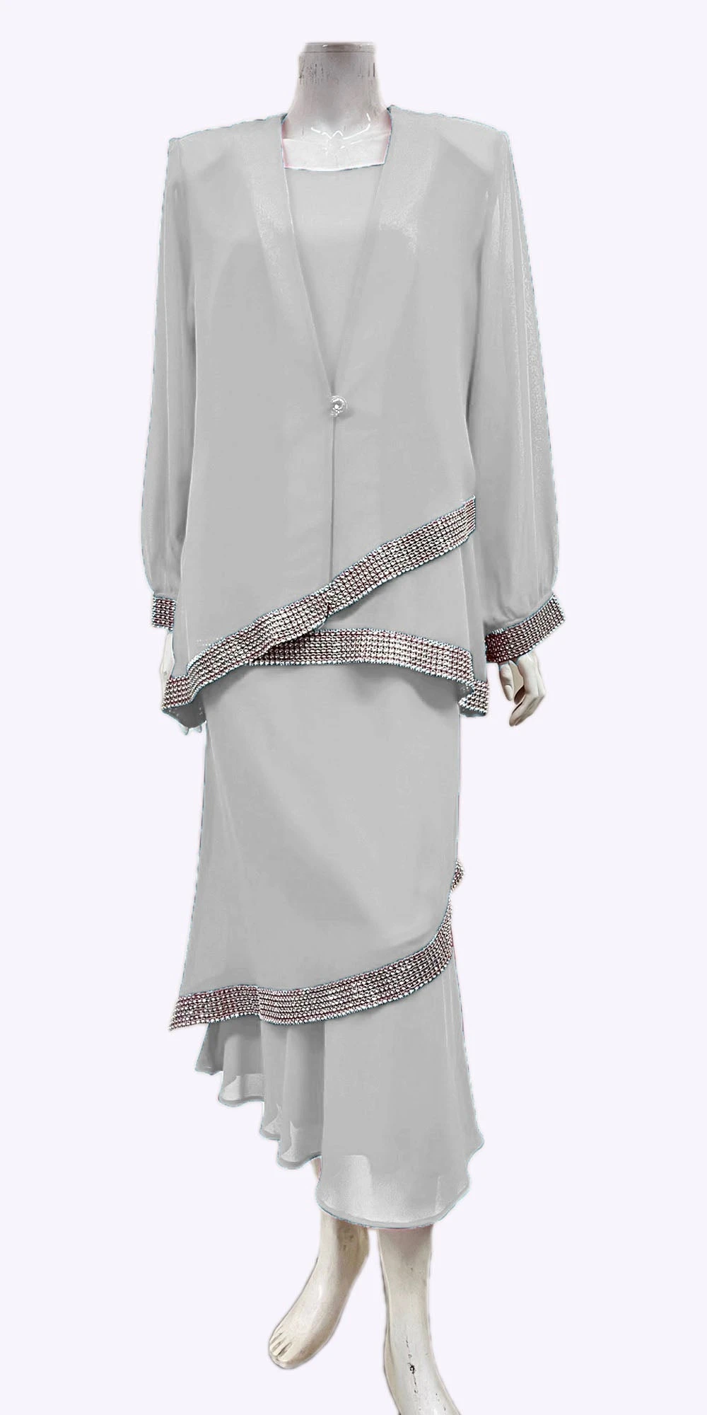 This Hosanna Design 5532 3-piece dress set is perfect for special occasions. Made in the USA with a comfortable elastic waistband, it features silvery beaded embellishments and includes a long sleeve jacket, sleeveless top, and asymmetrical tea length skirt. Stay modest and stylish with this outfit.