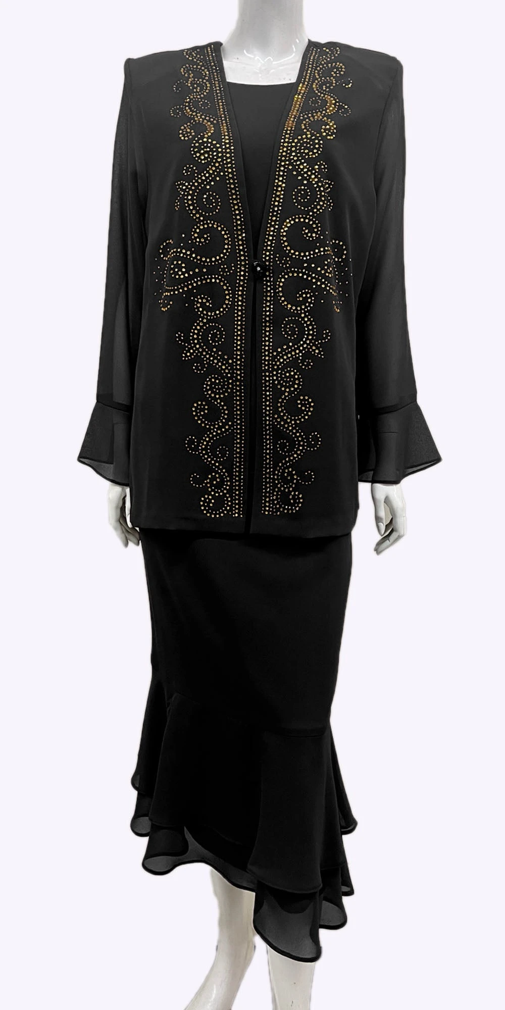The Hosanna Design 5535 3-piece dress set is perfect for any special occasion. Made in the USA, this modest outfit features gold beaded embellishments and an elastic waistband for comfort. The set includes a long sleeve jacket, sleeveless top, and asymmetrical tea length skirt, making it a versatile and fashionable choice.